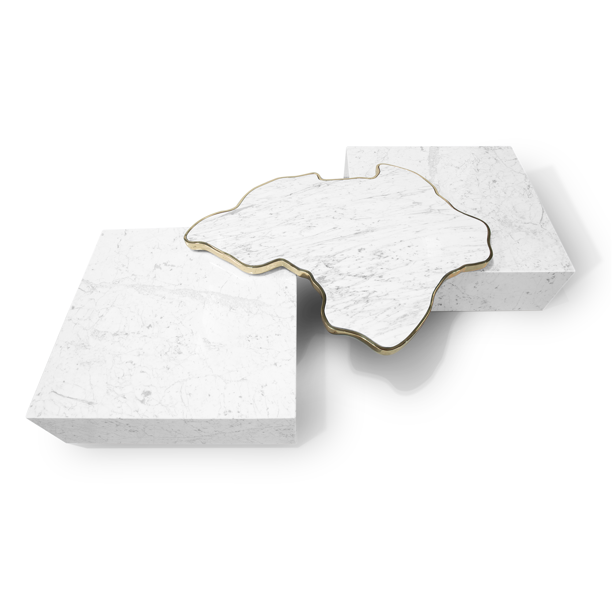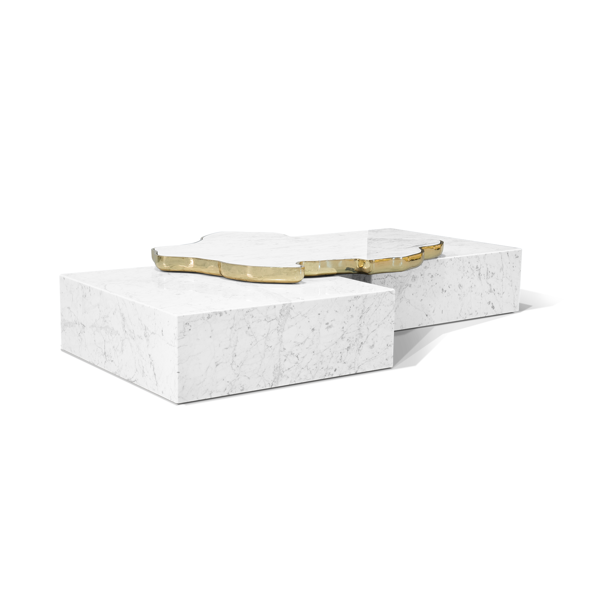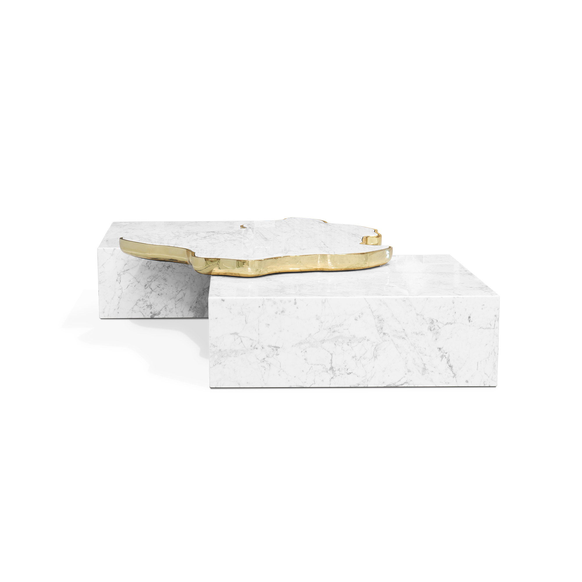 The design of Navarra modern center table captures unique Spanish warmth and finest craftsmanship. The rich colour background set off by thick and thin veins alike carries the eyes to the top of this table, framed by brass. Taking inspiration from its homeland, the Navarra coffee table brings an elegant flair into your home decoration. It is a contemporary center table composed by two square marble modules, linked by an organic marble surface element on top enveloped by casted brass. An exclusive design piece and polished choice for luxury home interiors.