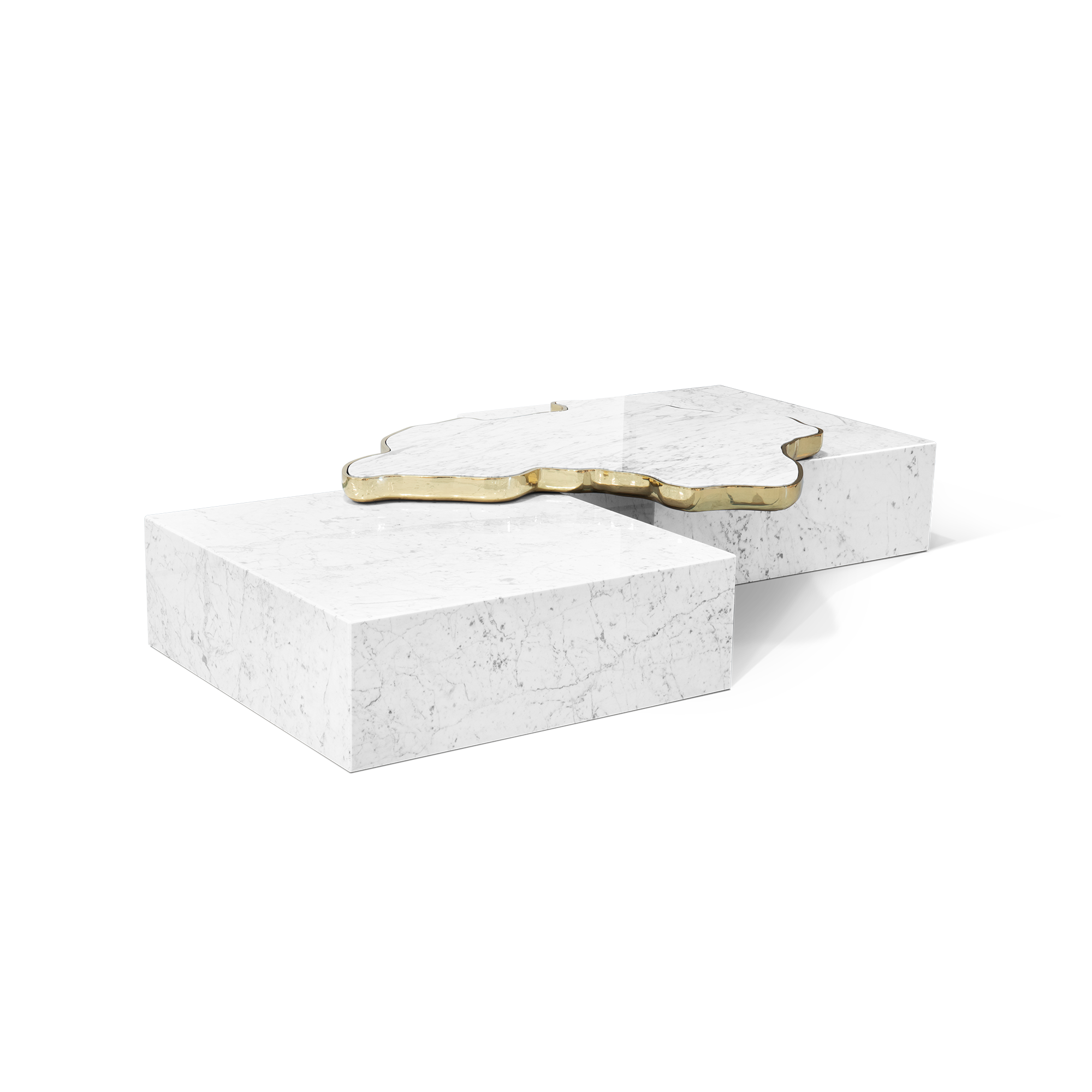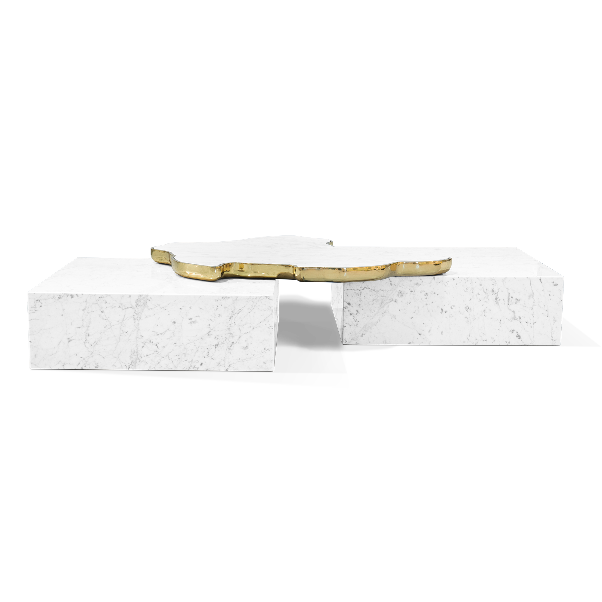 A contemporary center table composed by two square marble modules, linked by an organic marble surface element on top enveloped by casted brass.
