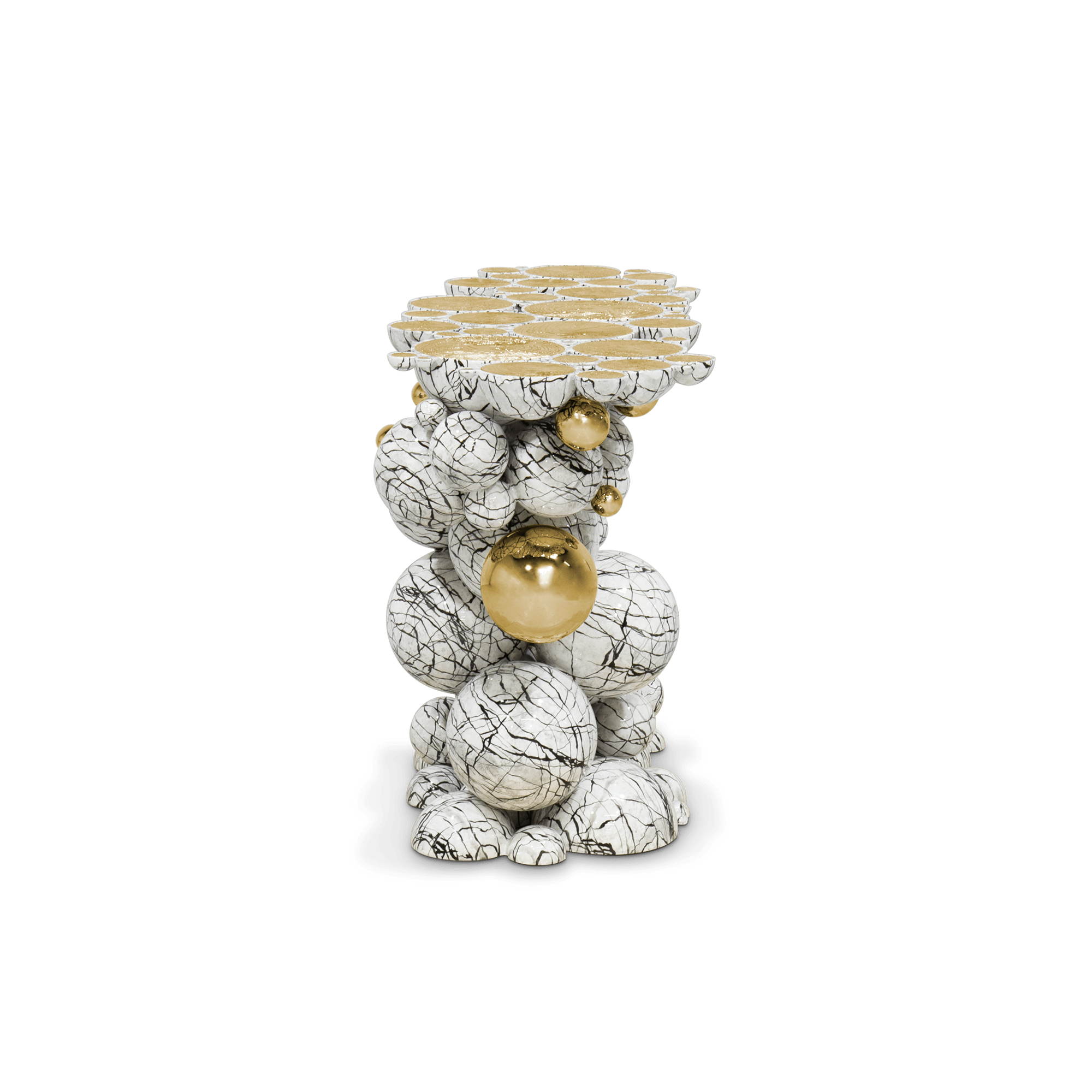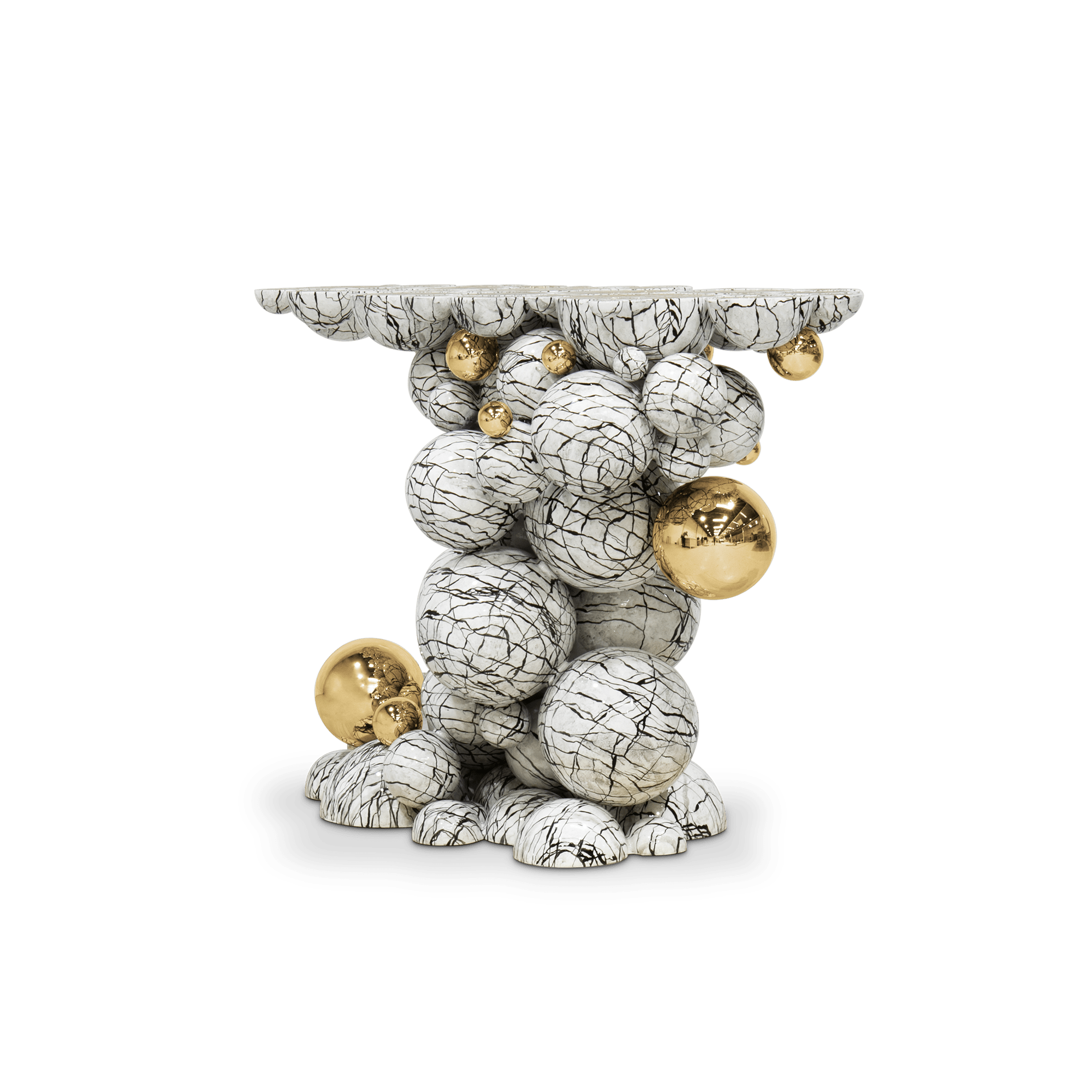 Defying the laws of physics, the Newton console has grown from the ancient art of casting metal, where metal is heated until molten into spheres and semi-spheres shape. One by one, each element is joined to produce an outstanding pattern and organic structure, finished in a faux-marble hand-painting technique and gold plated accents. The top of this console table is composed of brass circles carved with a golden texture similar to organic wood veins.