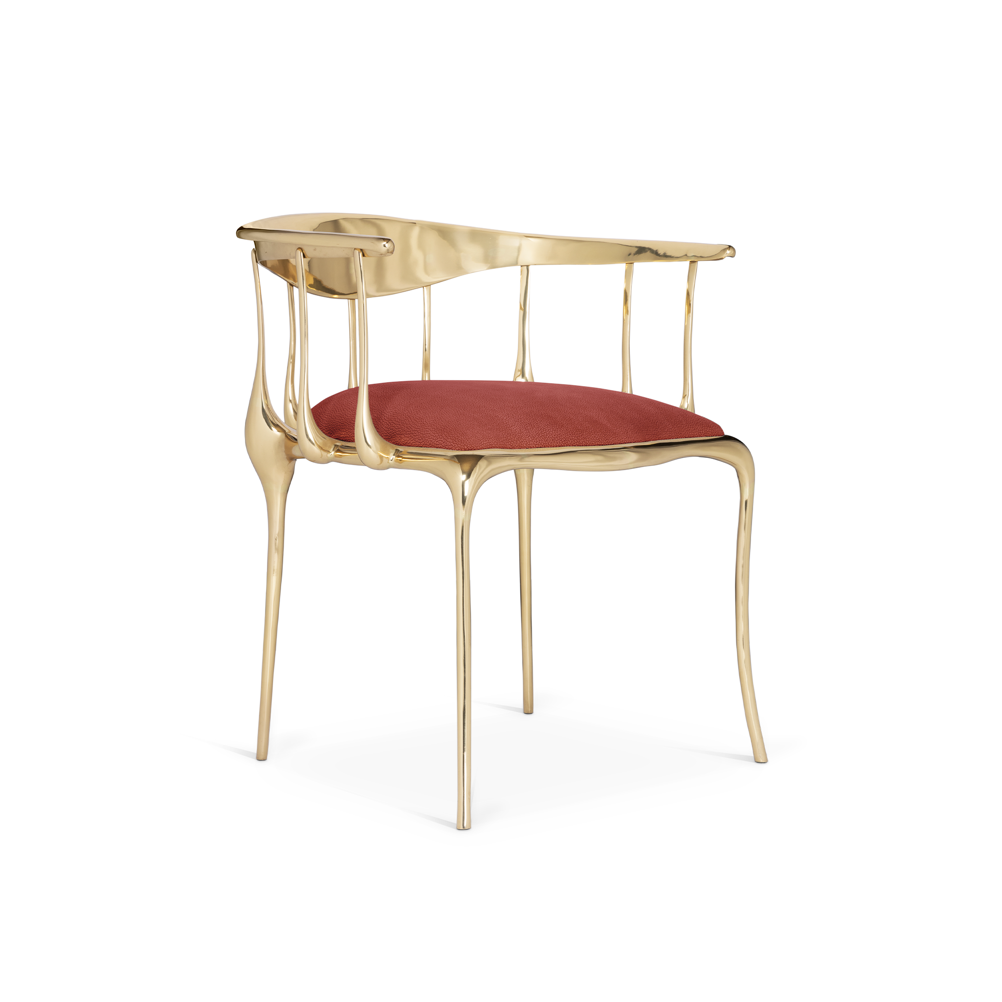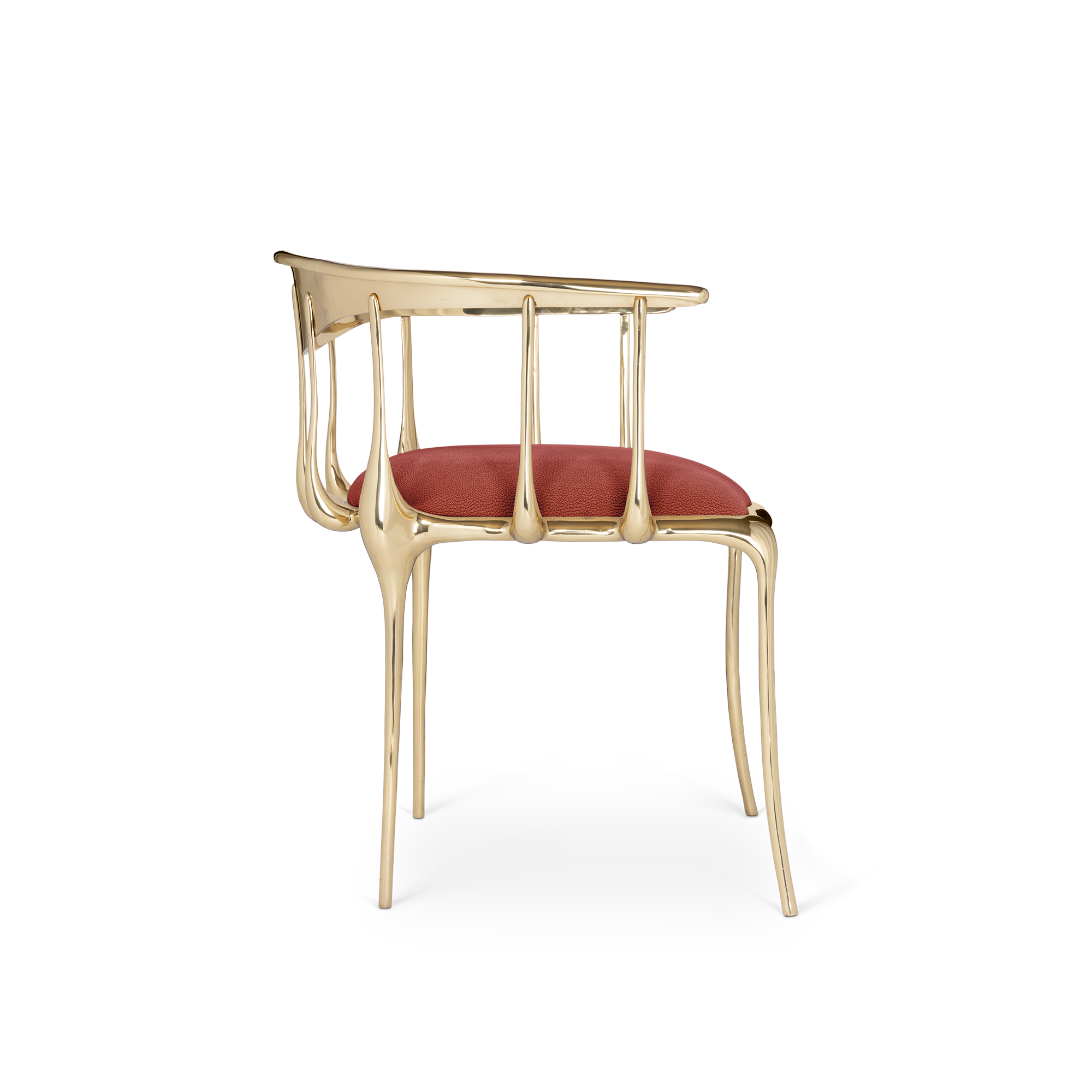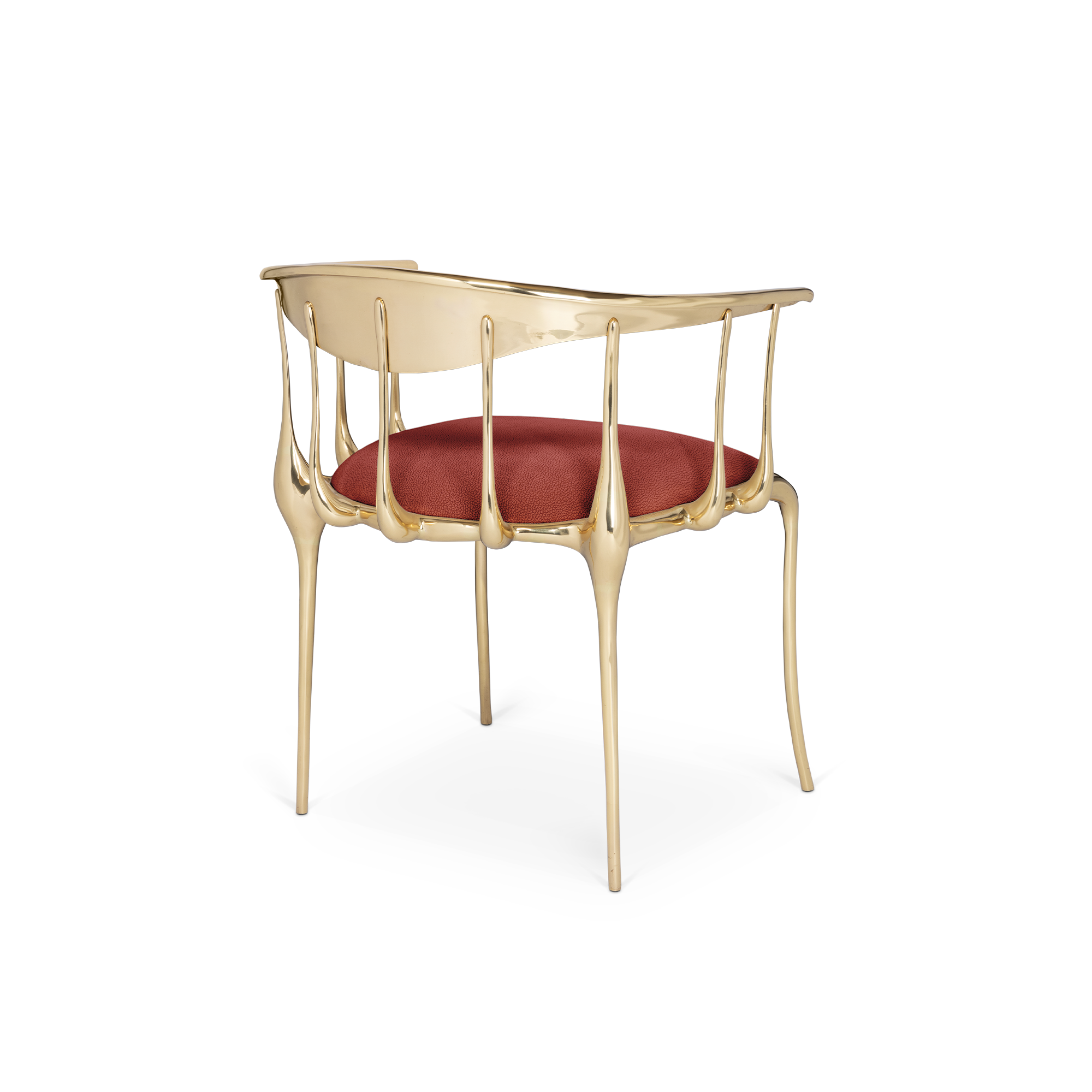 The Nº11 chair takes the cue from key figures of the surrealist movement such as Salvador Dali and René Magritte and turns their work into a subtle art furniture piece. Made from gold plated solid cast brass with a varnish finish, this accent chair features a large bow back rail that’s held by languid spindles that drip solid metal from the apron up, while the legs are lavishly curved creating a visual effect that defies the laws of physics. The seat is upholstered in fine velvet and is available in different colors to better suit any upscale dining or living room. Combining an avant-garde approach with classic and emblematic lines, Nº 11 features remarkable craftsmanship and embodies the richest metalwork techniques from which skilled artisans built their reputation throughout the years. A statement chair to enhance a glamorous experience and memorable moments.