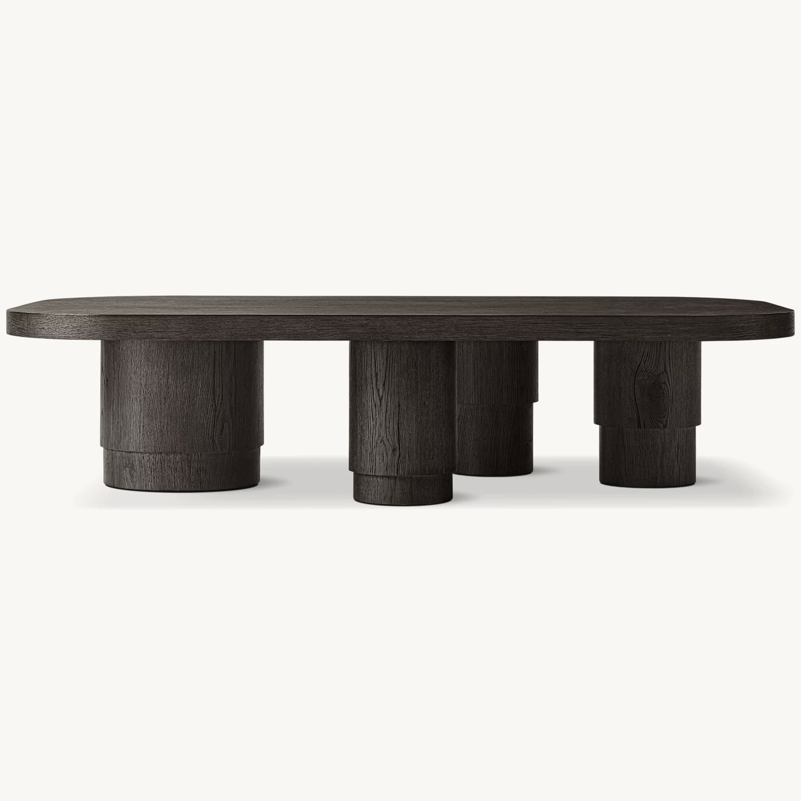 A multistep high-heat finishing process enhances the natural grain pattern and results in a rustic look with distinctive cracking and purposeful imperfections; after heating, the oak is wire brushed by hand and stained to a matte finish