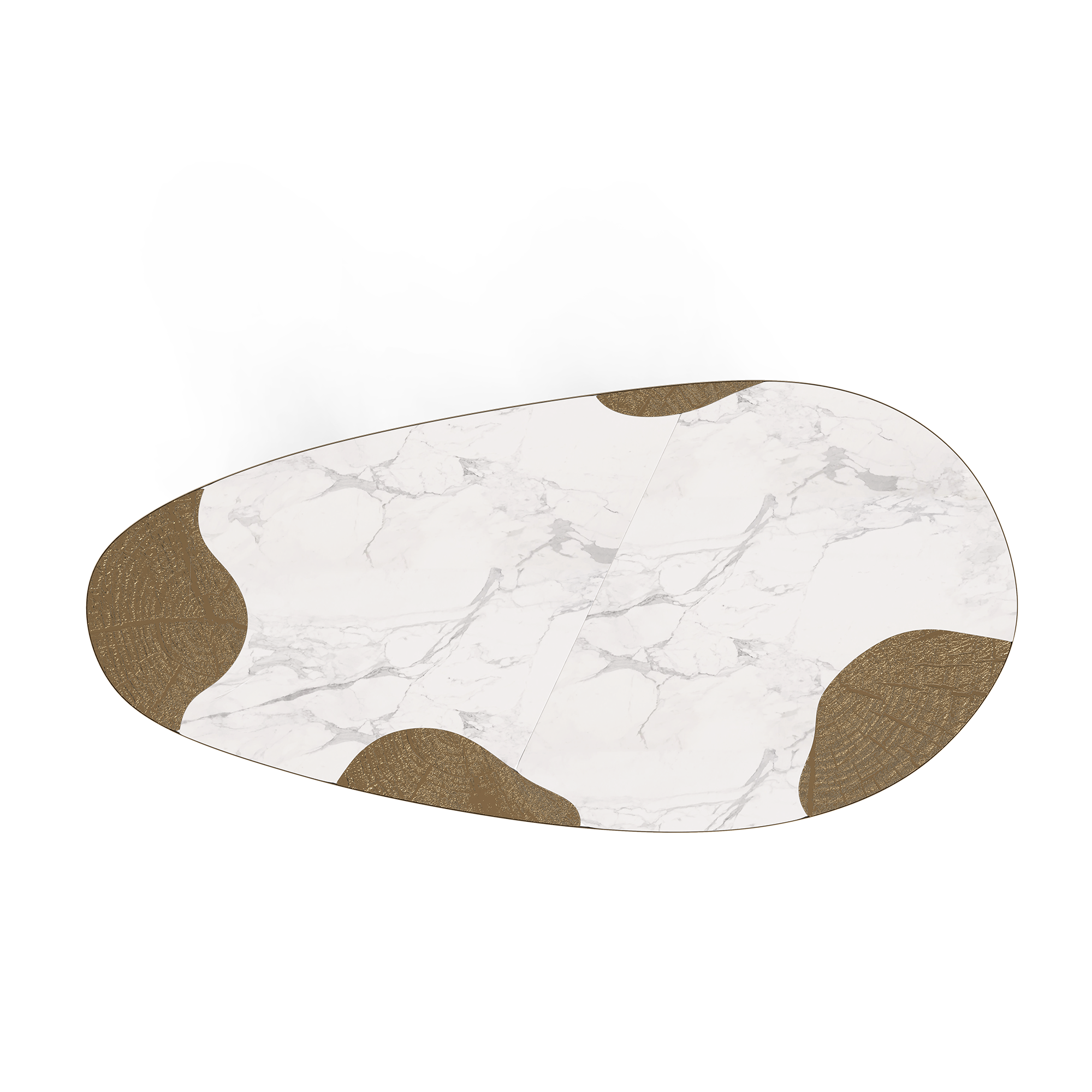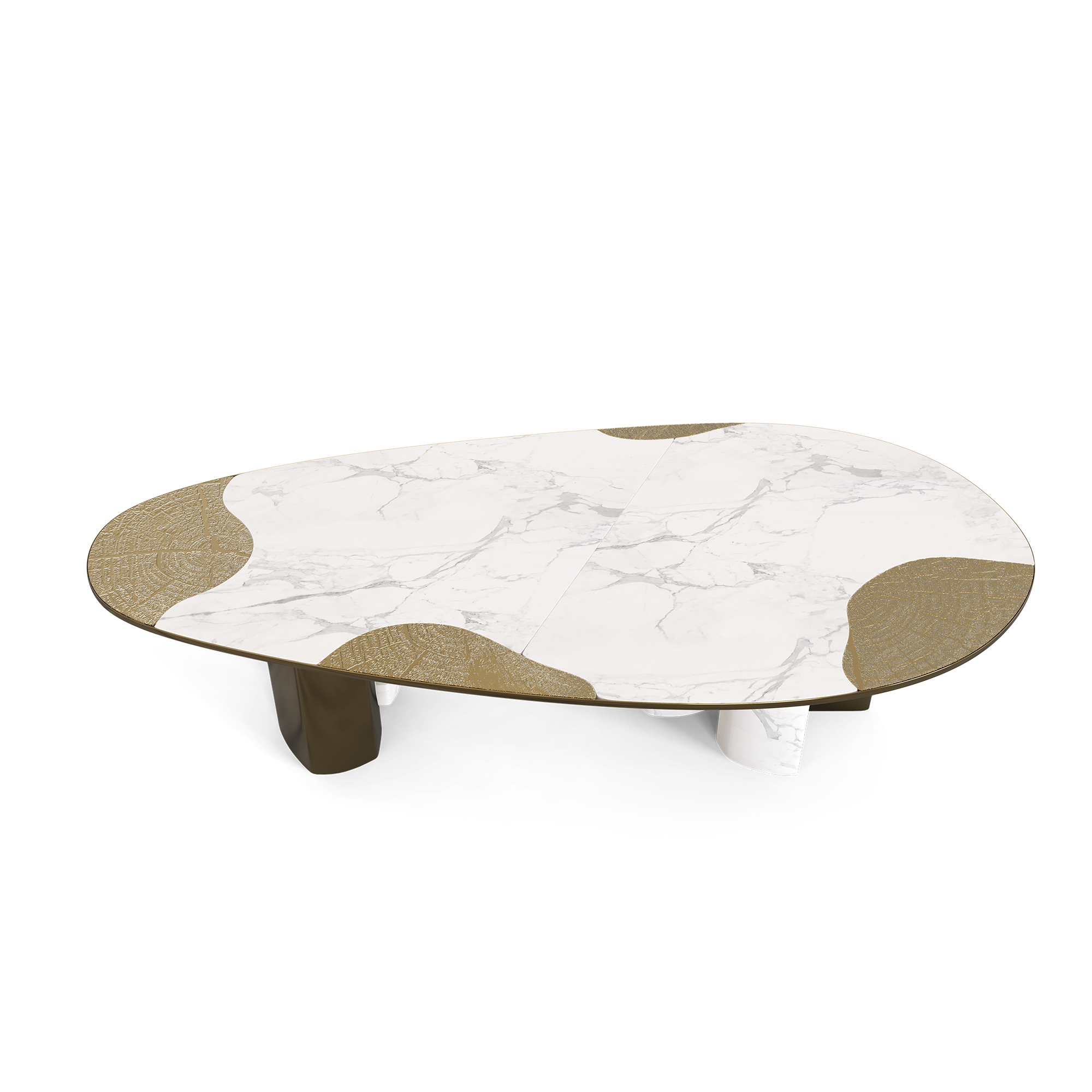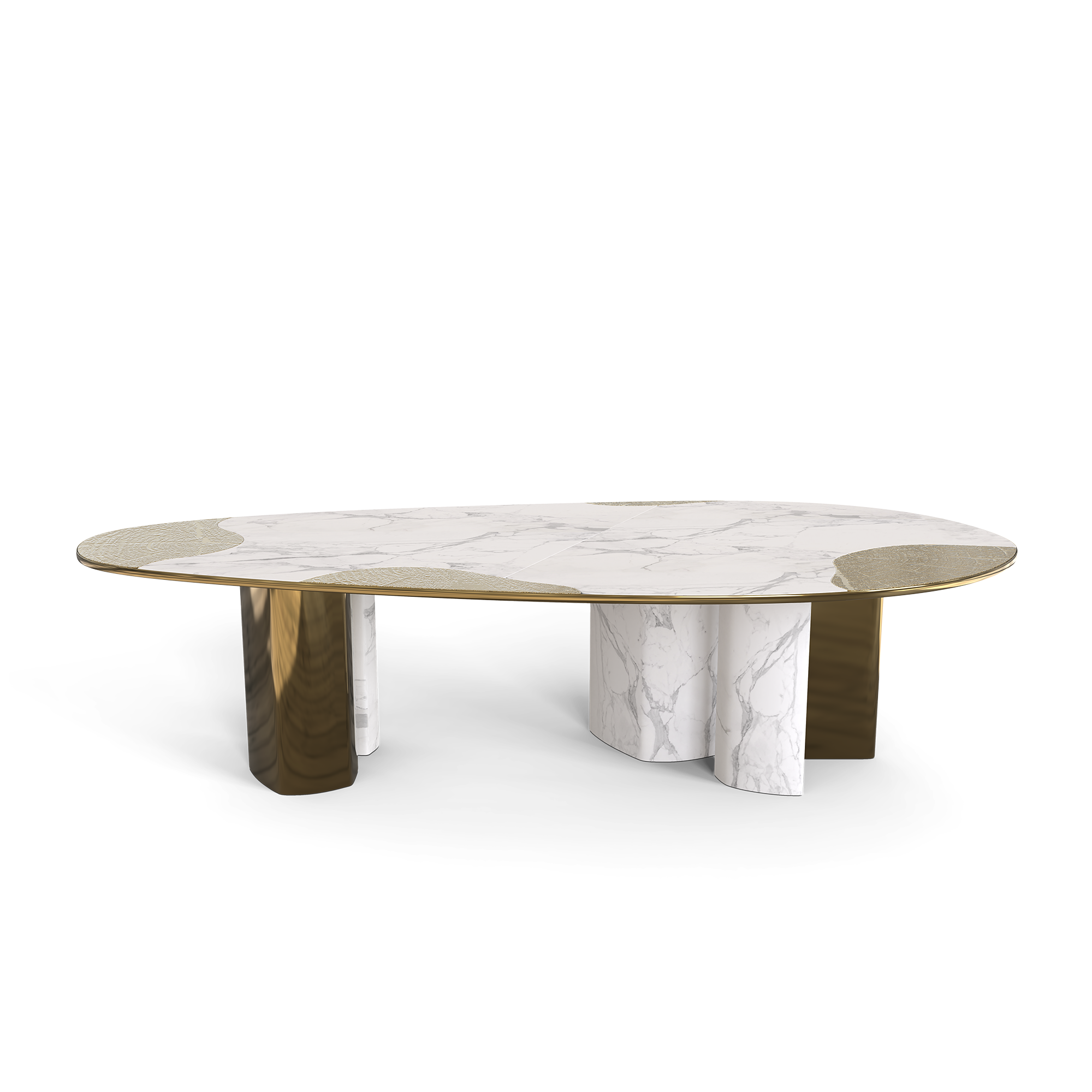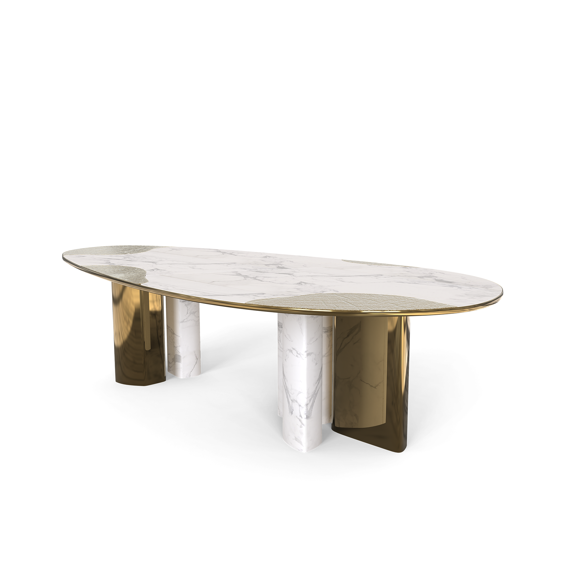 The Ophelia dining table set is produced in Calacatta marble and casted brass with a gold plated finish. It contains five feets two in Metal and three in Marble. The Table top contains two slabs of marble.