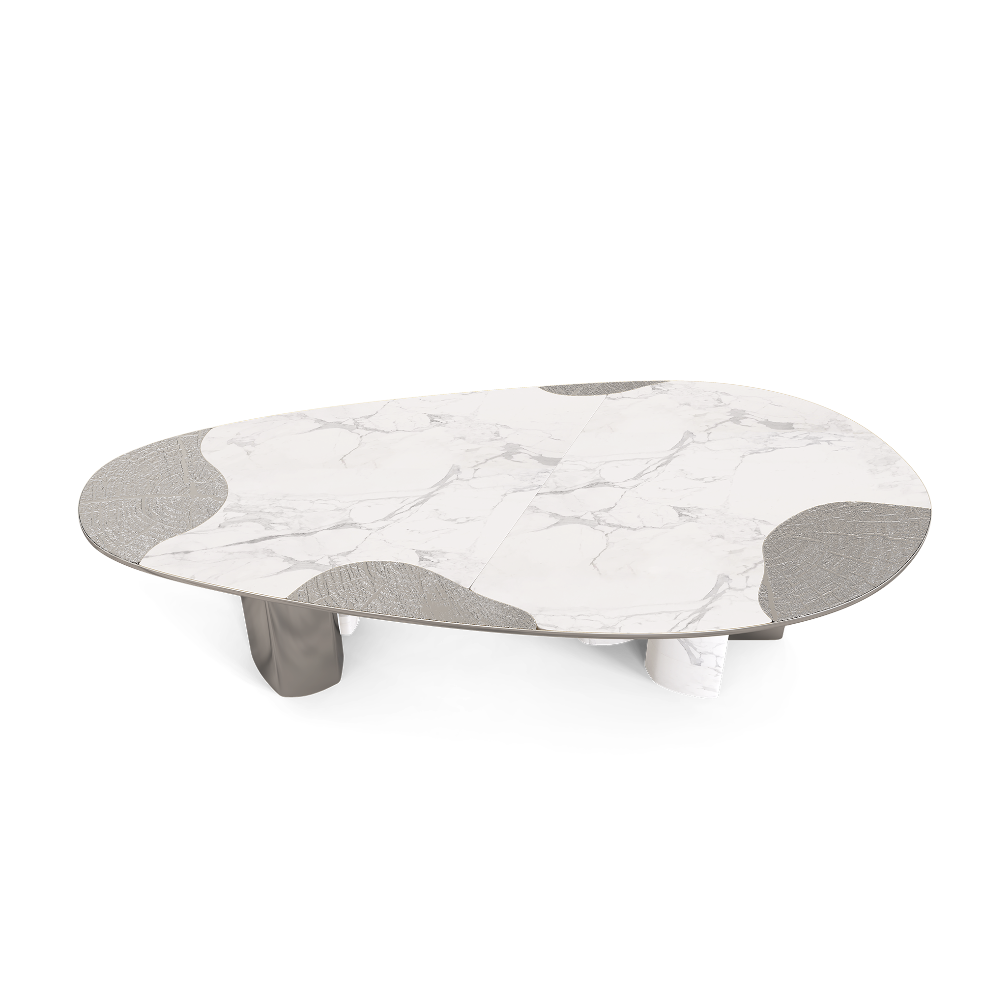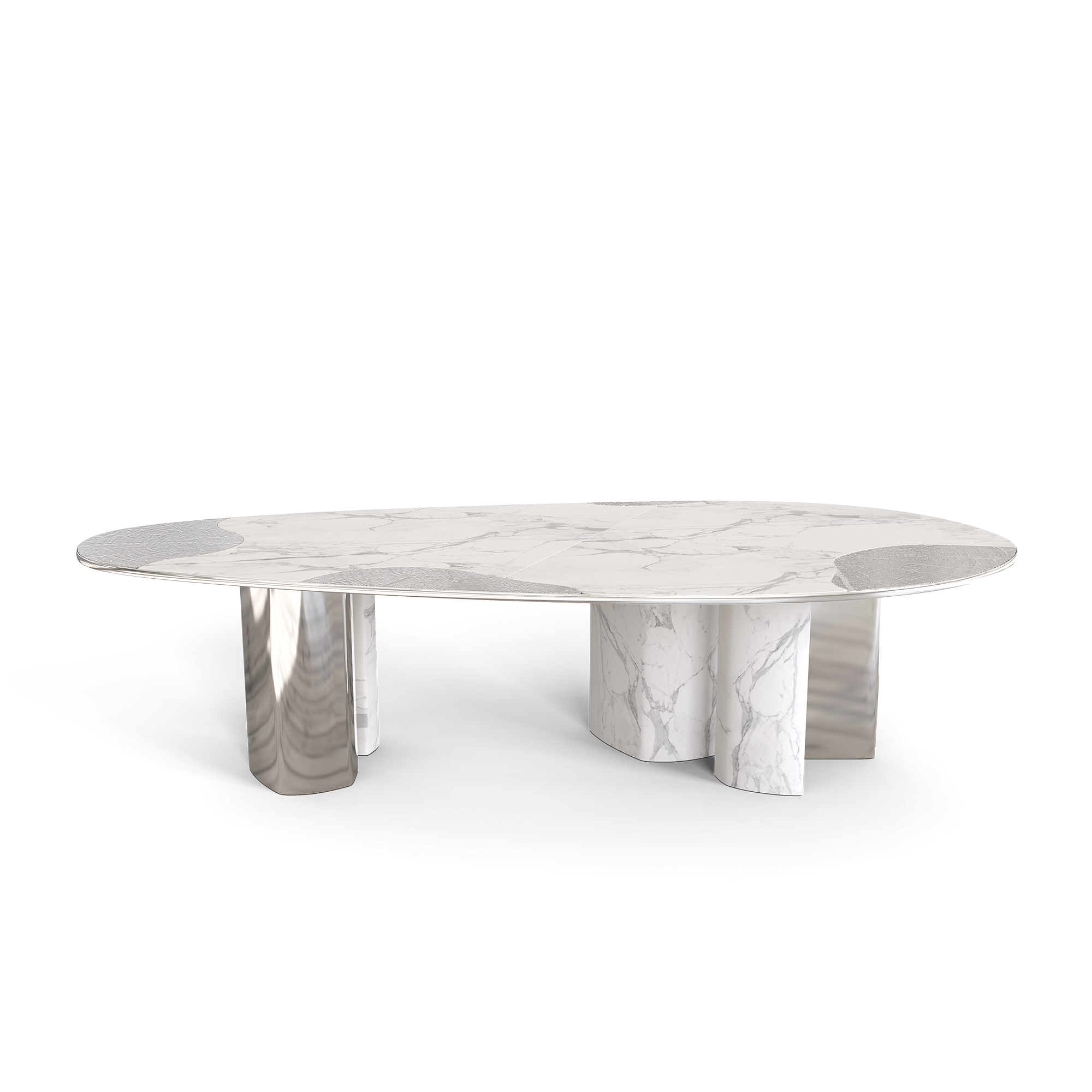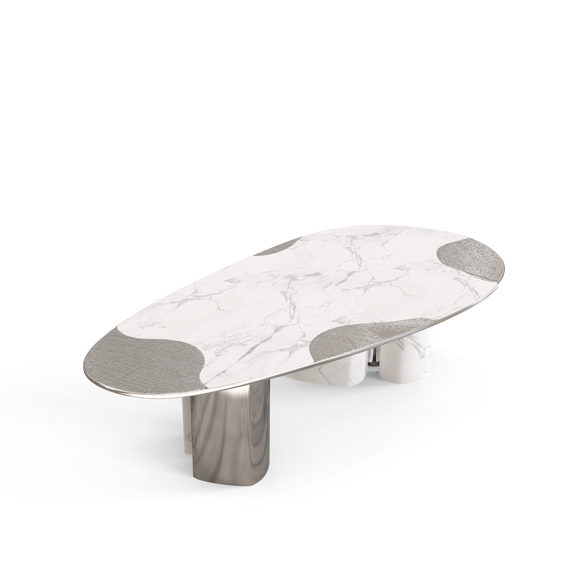 The Ophelia dining table set is produced in Calacatta marble and casted brass with a gold plated finish. It contains five feets two in Metal and three in Marble. The Table top contains two slabs of marble.