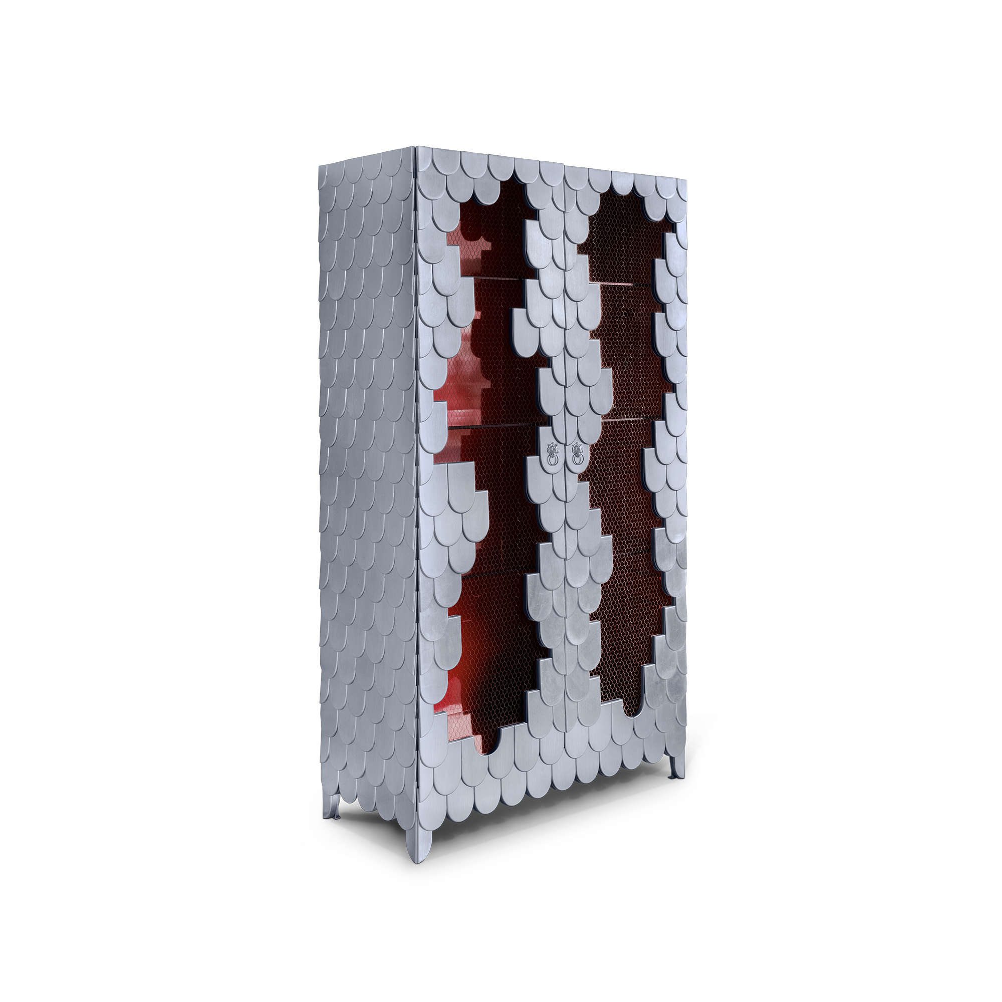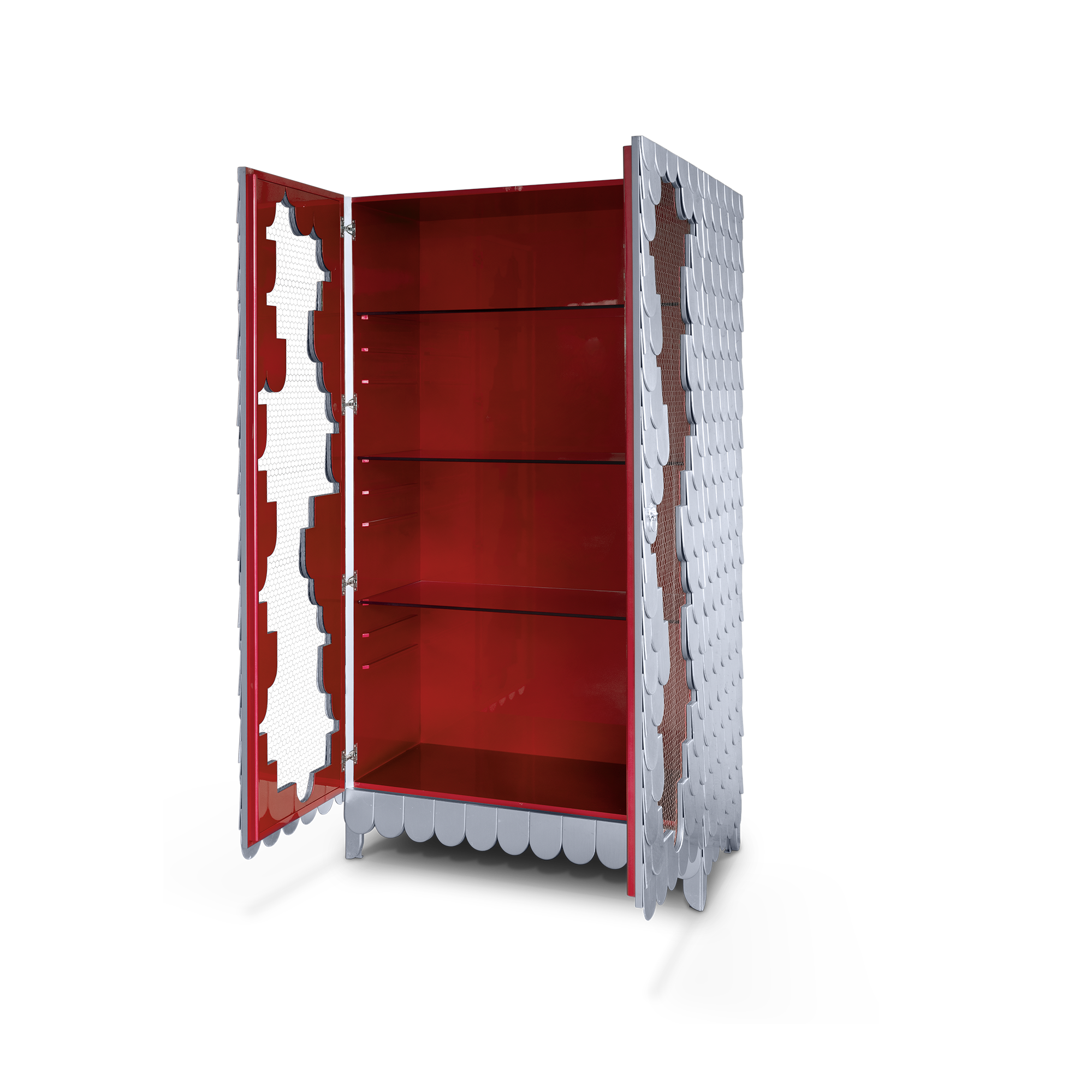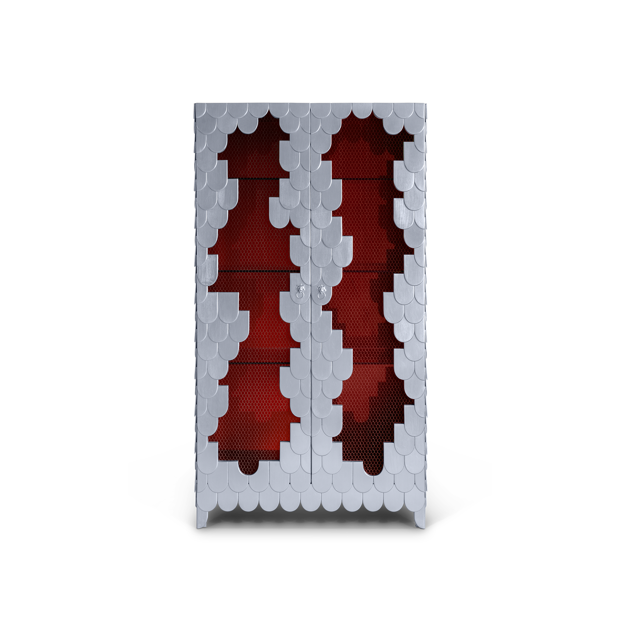 Cabinet in wood, finished with silver leaf. Its base has a metal reinforcement. In its interior, there are three shelves in glass. The handles have a lion shape and are finished with silver leaf. The interior is finished with silver leaf, with a high gloss translucent varnish.