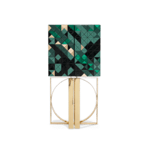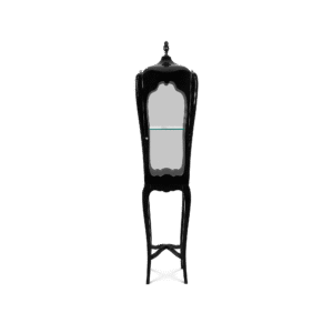 The black detailed frame is handcrafted in mahogany and supports four panels of clear glass. Behind its door that opens through a golden knob and closing switch, the interior boasts a single shelf in tempered glass. A versatile yet timeless case piece to showcase precious objects in different private homes or contract projects, from the most contemporary interior design rooms to the most classic interiors.