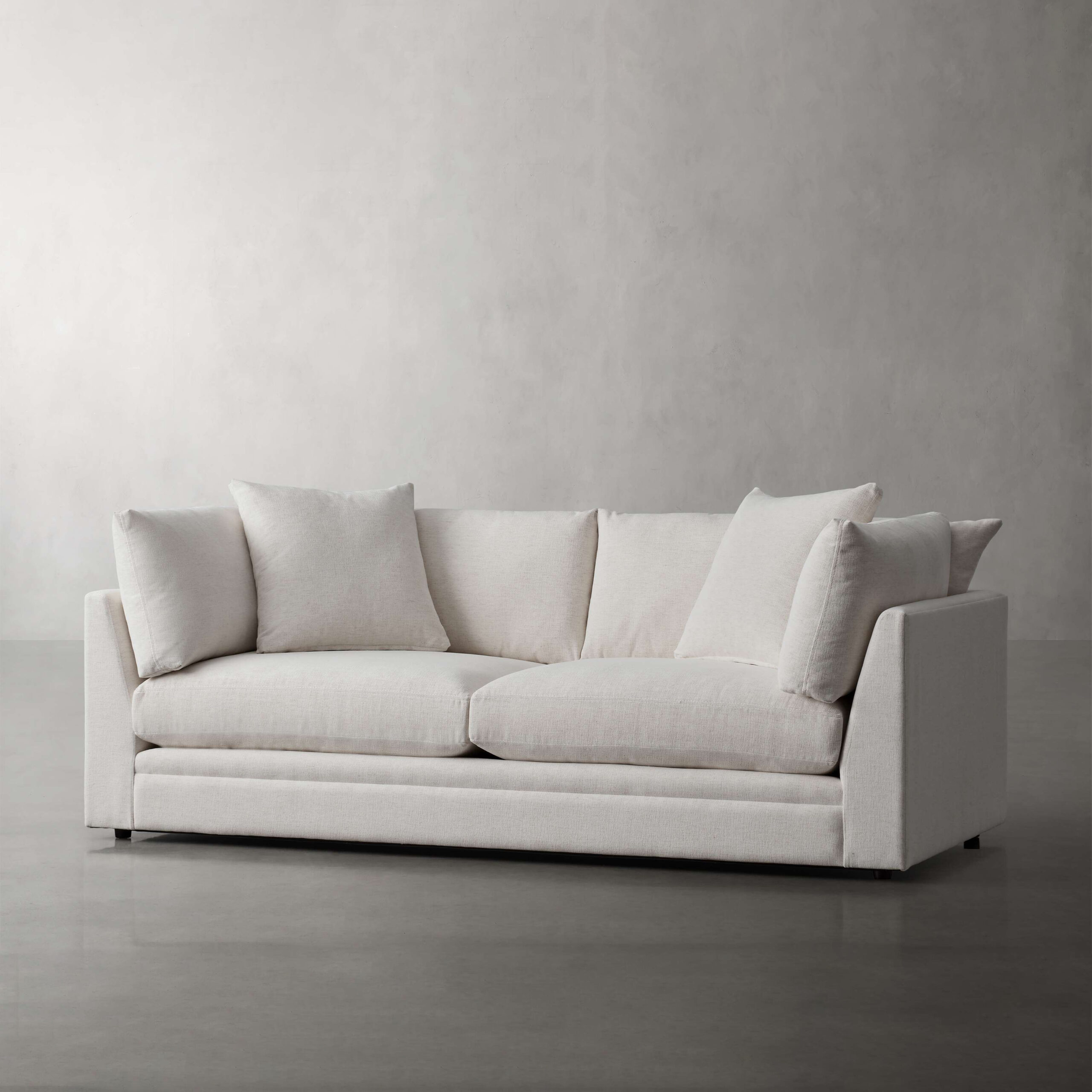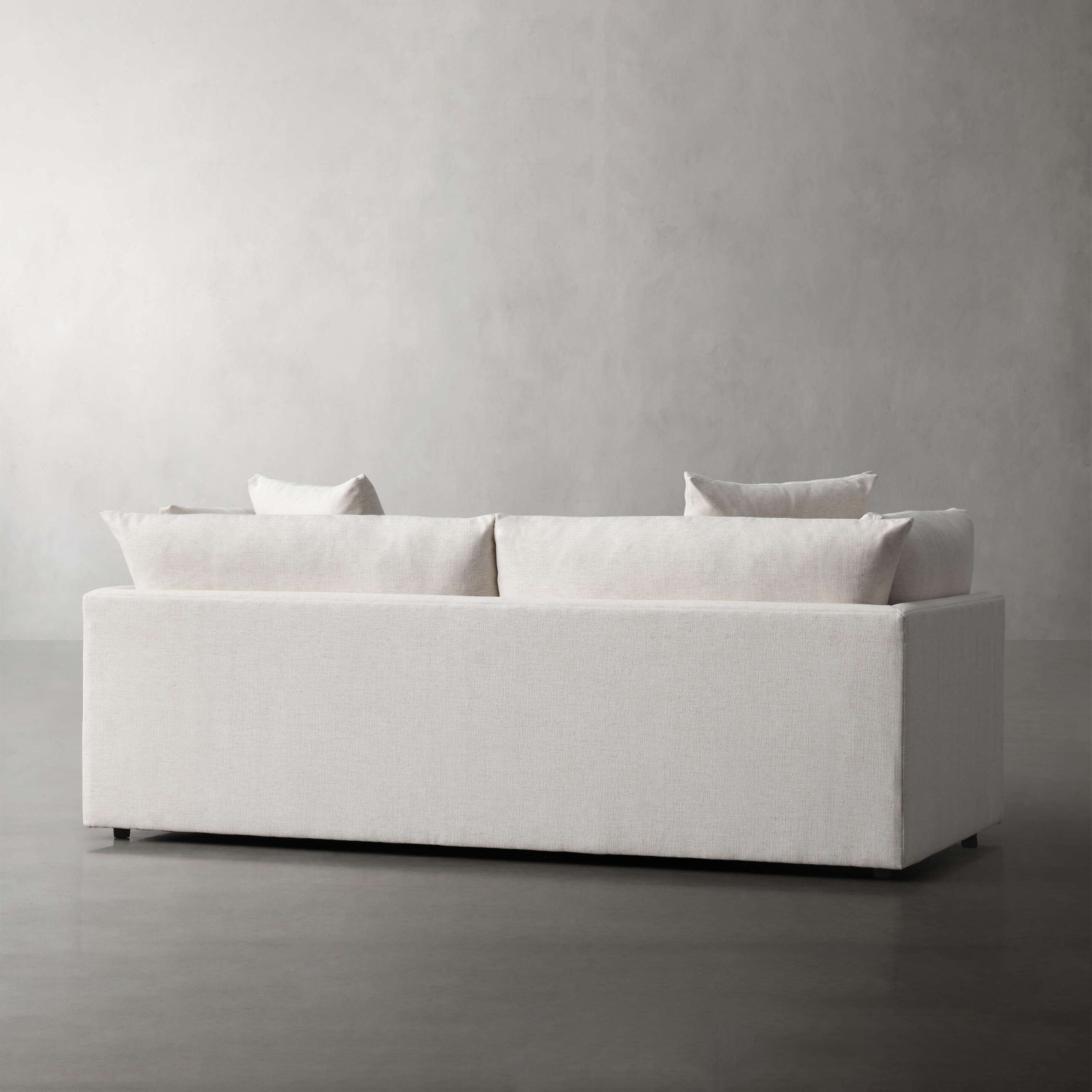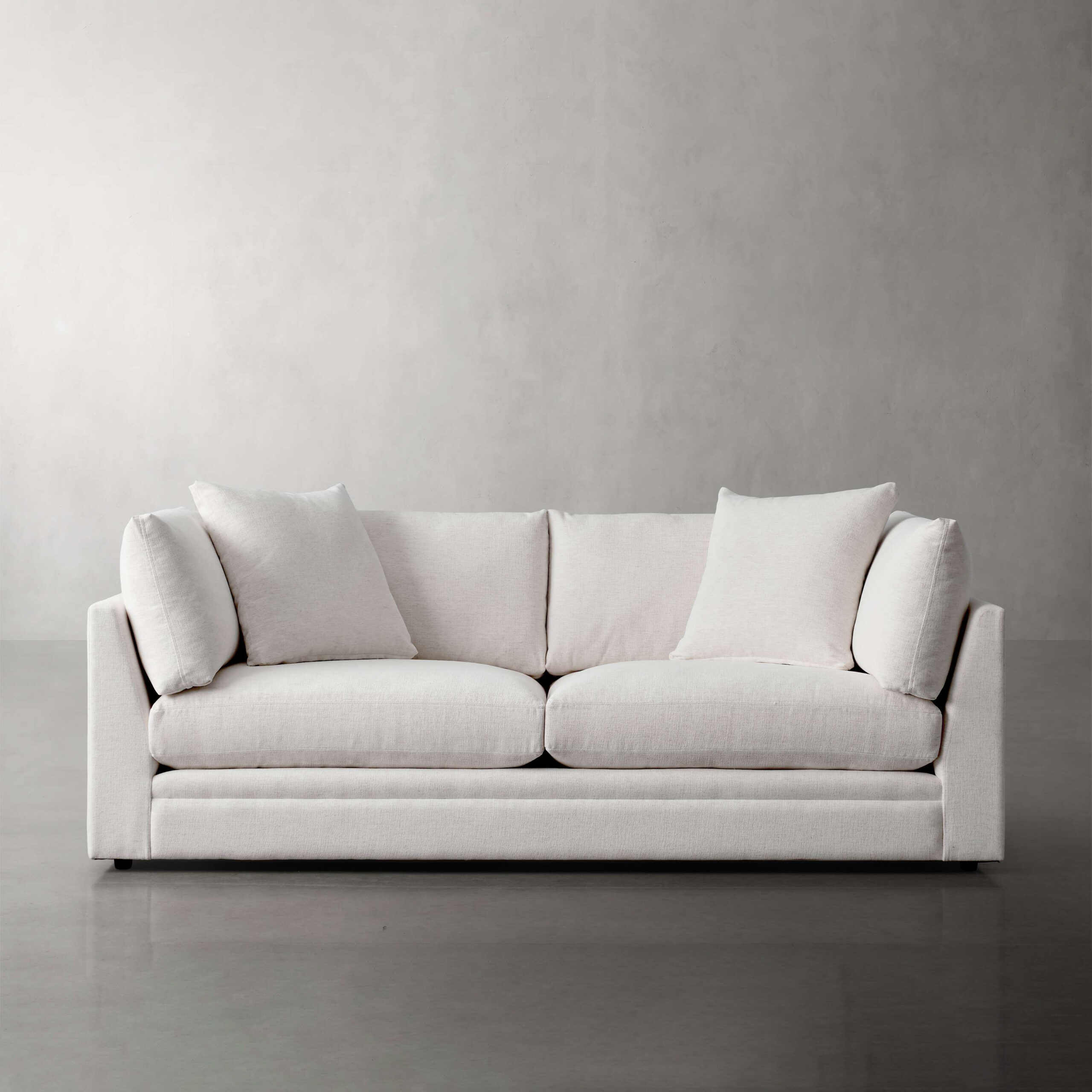 Seat cushions contain dense foam made from partially plant-based material, padded with poly-fiber and a blend of sterilized down and feathers.