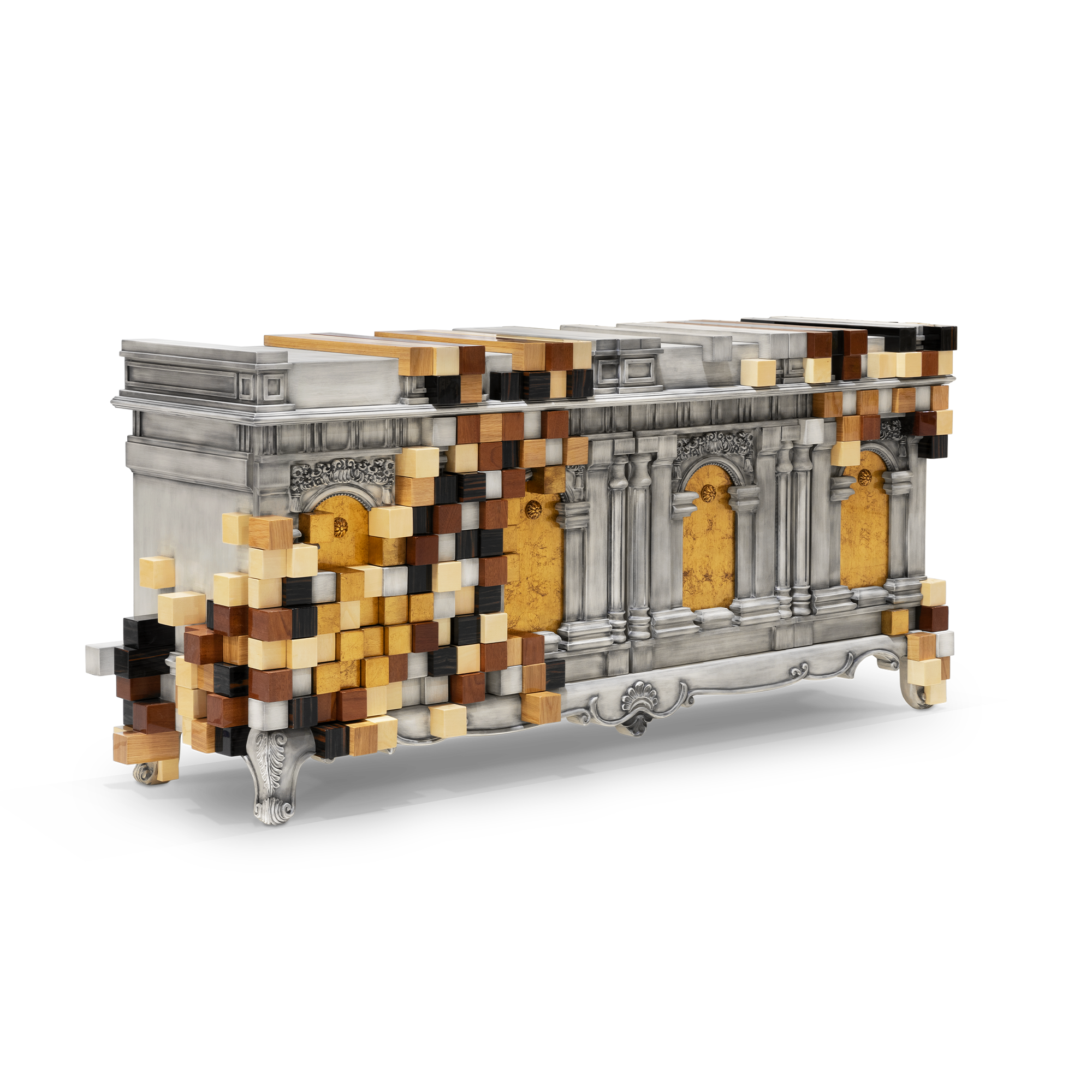 The inside shows a clean exquisite mirrored interior containing four drawers and two shelves made from smoked glass. The resulting works are a blend of enchanting fantasy and potent reality.