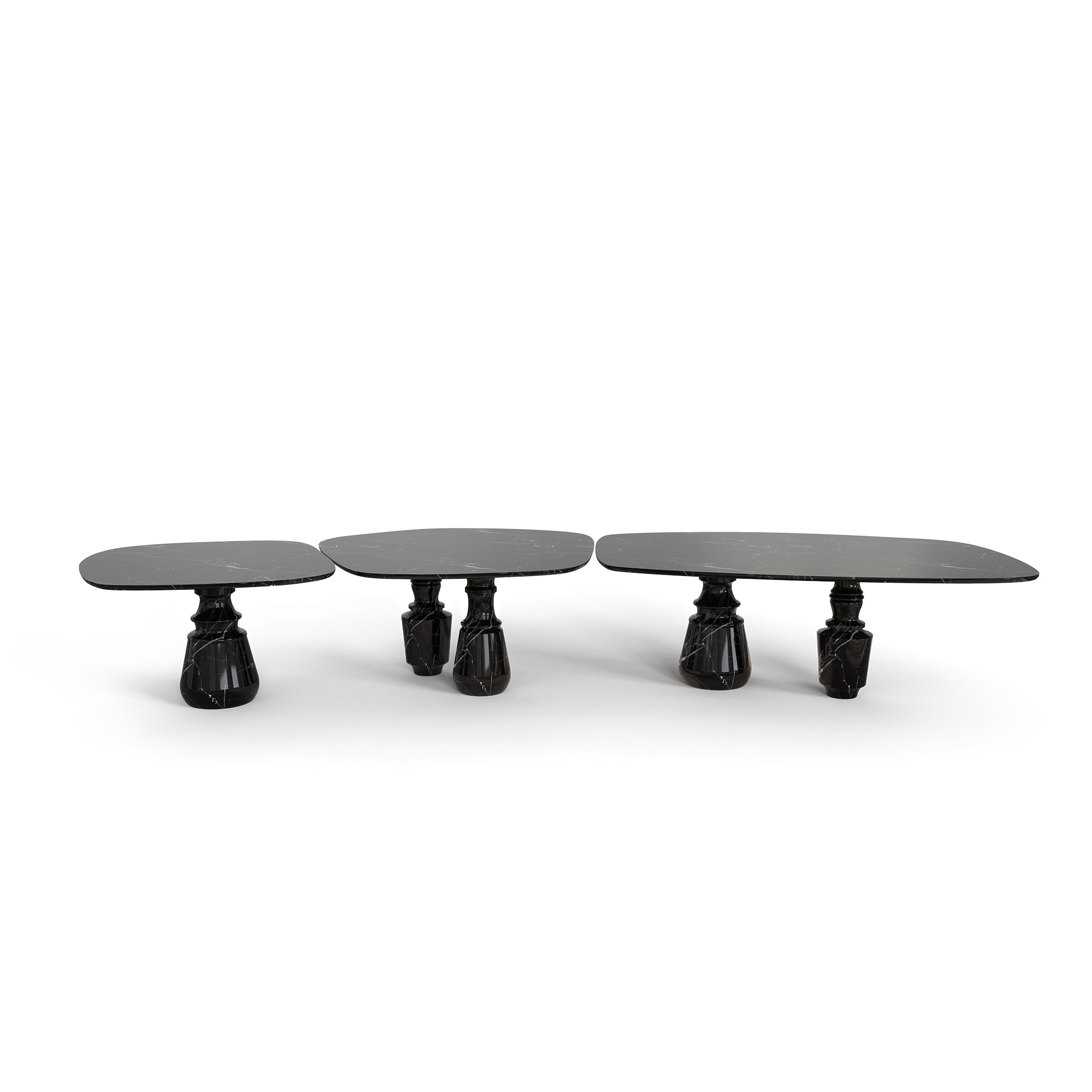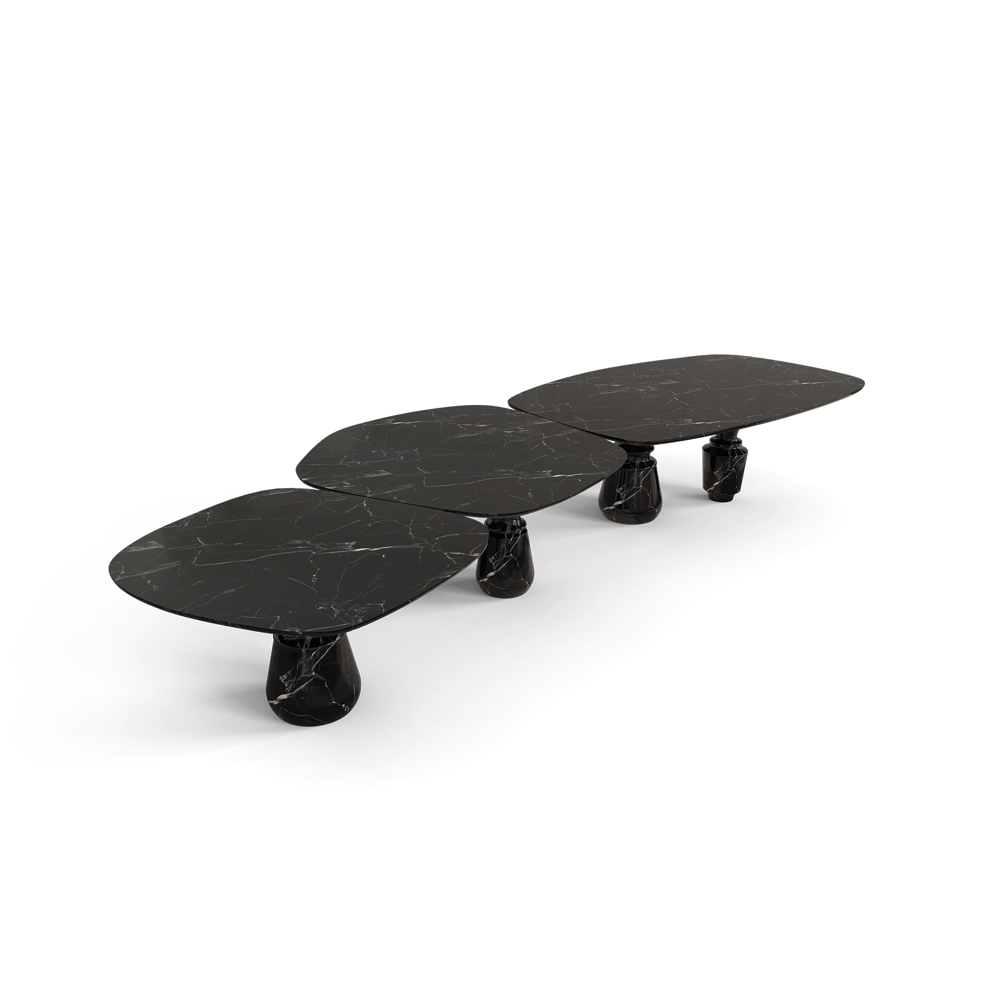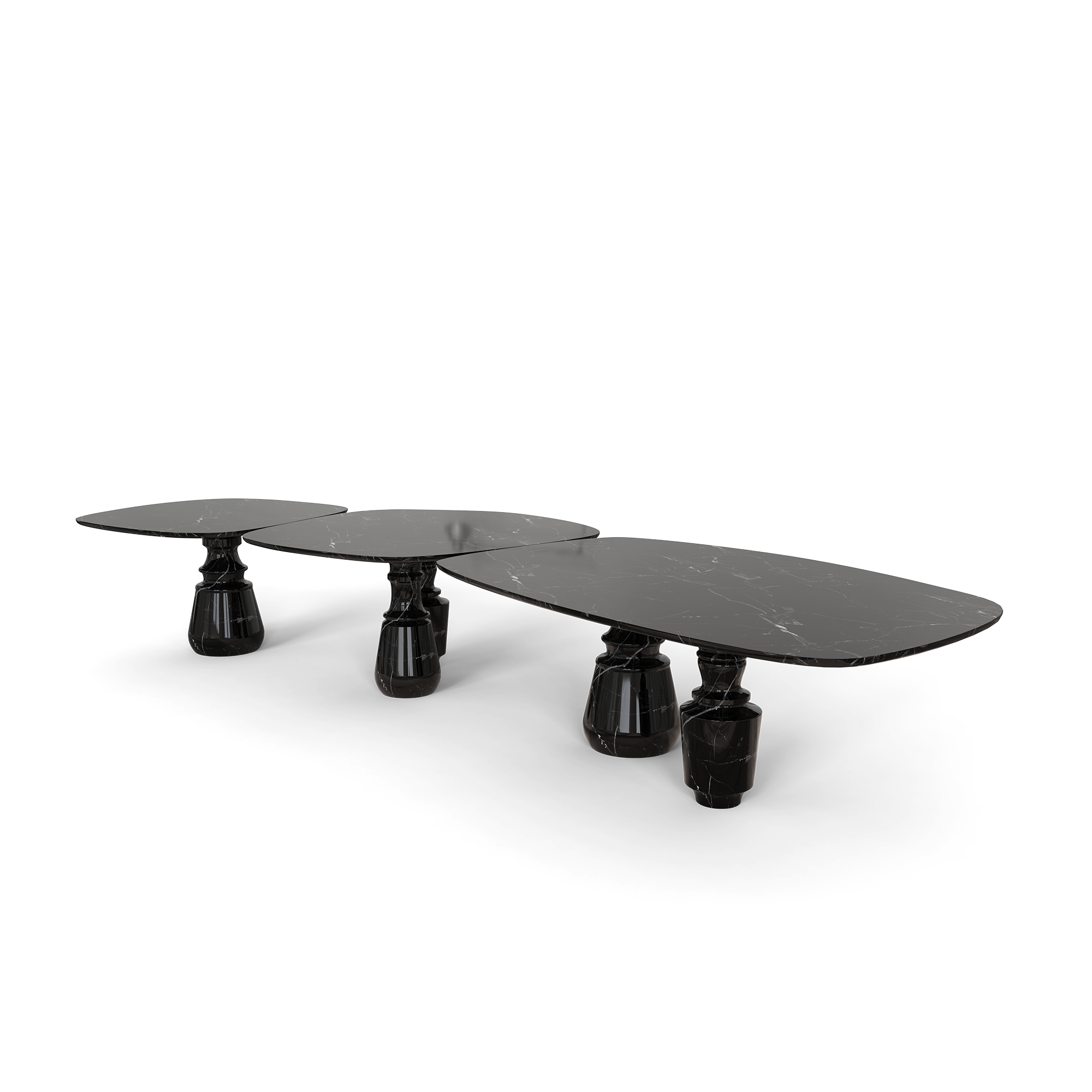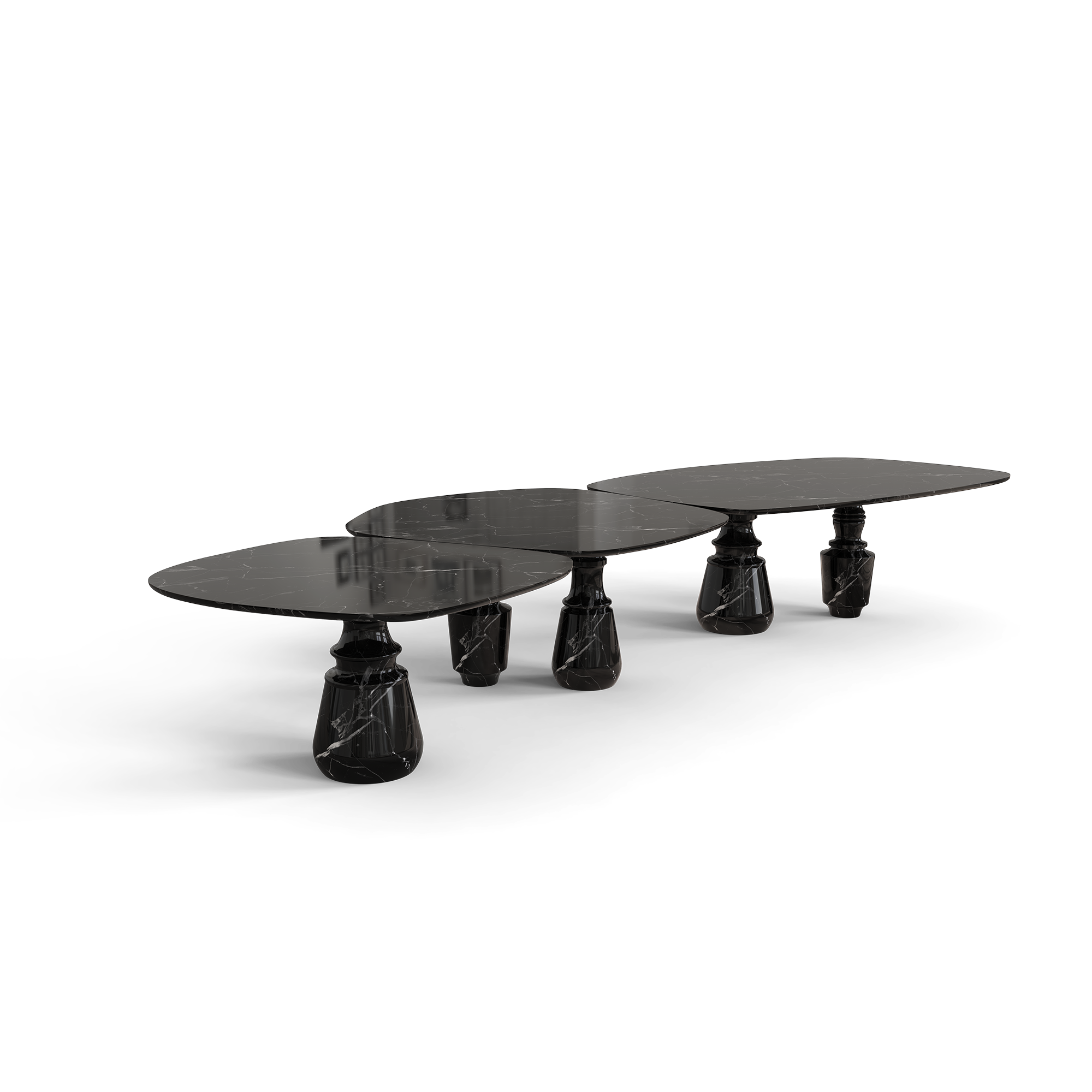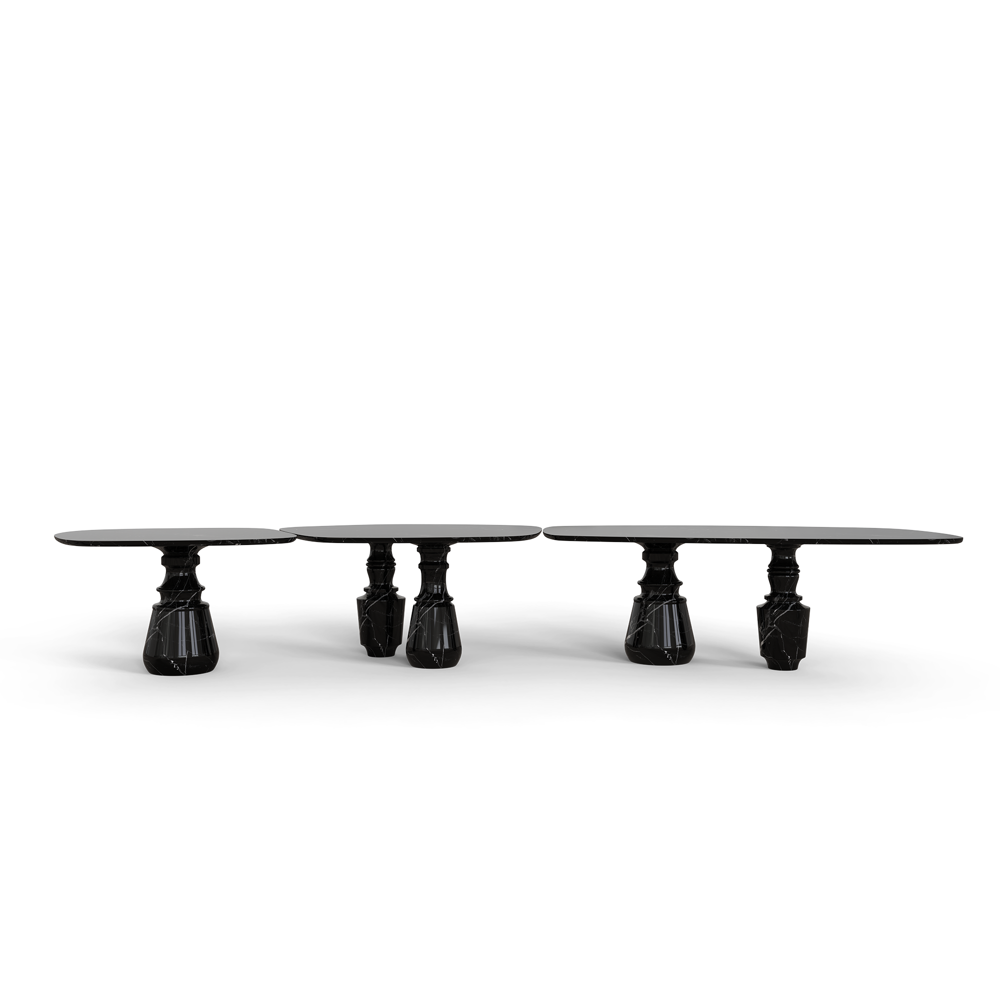 Playing with function and sculptural form, the Pietra Modular dining table creates a timeless experience through its classic aura and the finest black Nero Marquina marble. Harking back to the Renaissance era, its oval top rests gently on two sturdy marble columns, each designed from solid blocks carved by hand and turned to create different details for added texture. This table is made up of three separate pieces, allowing for unprecedented versatility. The pieces can be configured in a variety of ways, adapting to different spaces and needs. Pietra Modular stands out in any environment, whether for a linear arrangement or a more dynamic composition. A noble material sculpted in the workshops, it creates a dining table with soul, ideal for elegant and refined dining rooms. Pietra’s contemporary touch is sleek and it is suitable for indoor or outdoor us