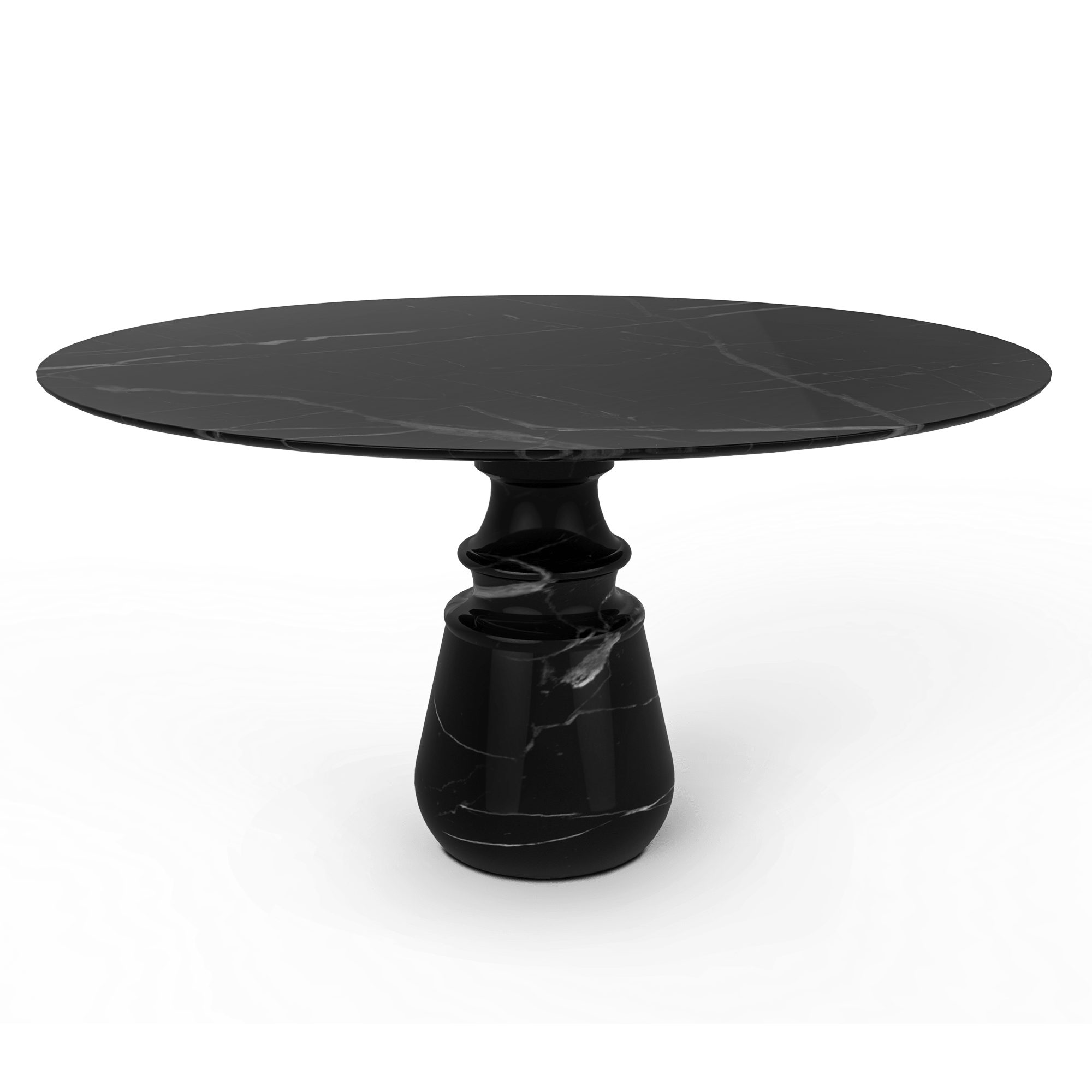 Playing with function and sculptural form, Pietra dining table shapes a timeless experience through its classical aura and finest Nero Marquina black marble. Reminding the renaissance era, its round top gently lies in one robust marble column, conceived from a solid block hand-sculpted and turned to create different details for additional texture. A noble material carved in Boca do Lobo workshops, conceiving a statement black table ideal for a grand entryway, elegant dining rooms or other open settings. Ideal as a four-seater table, the contemporary feel of Pietra is effortlessly stylish and it is suitable for indoor or outdoor use.