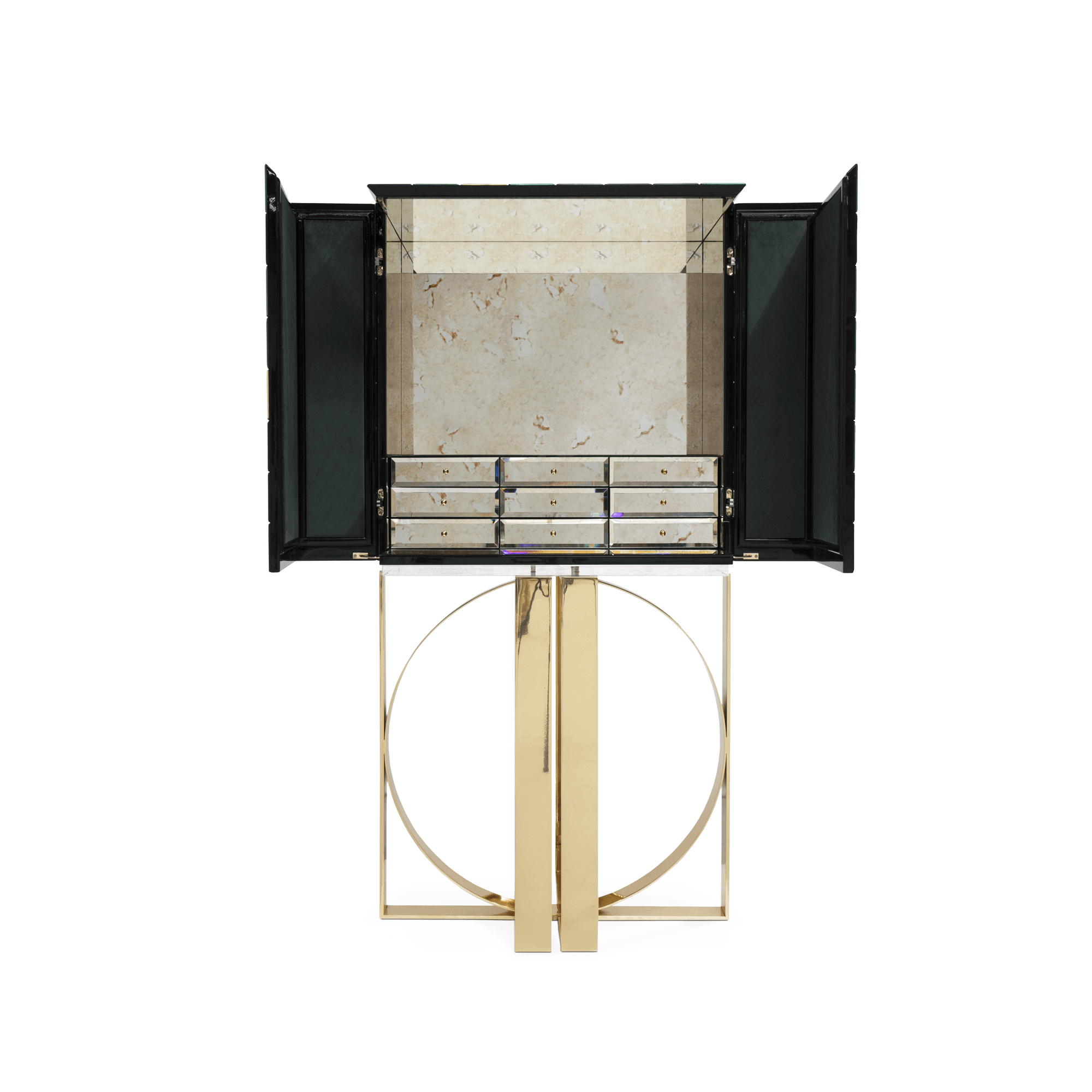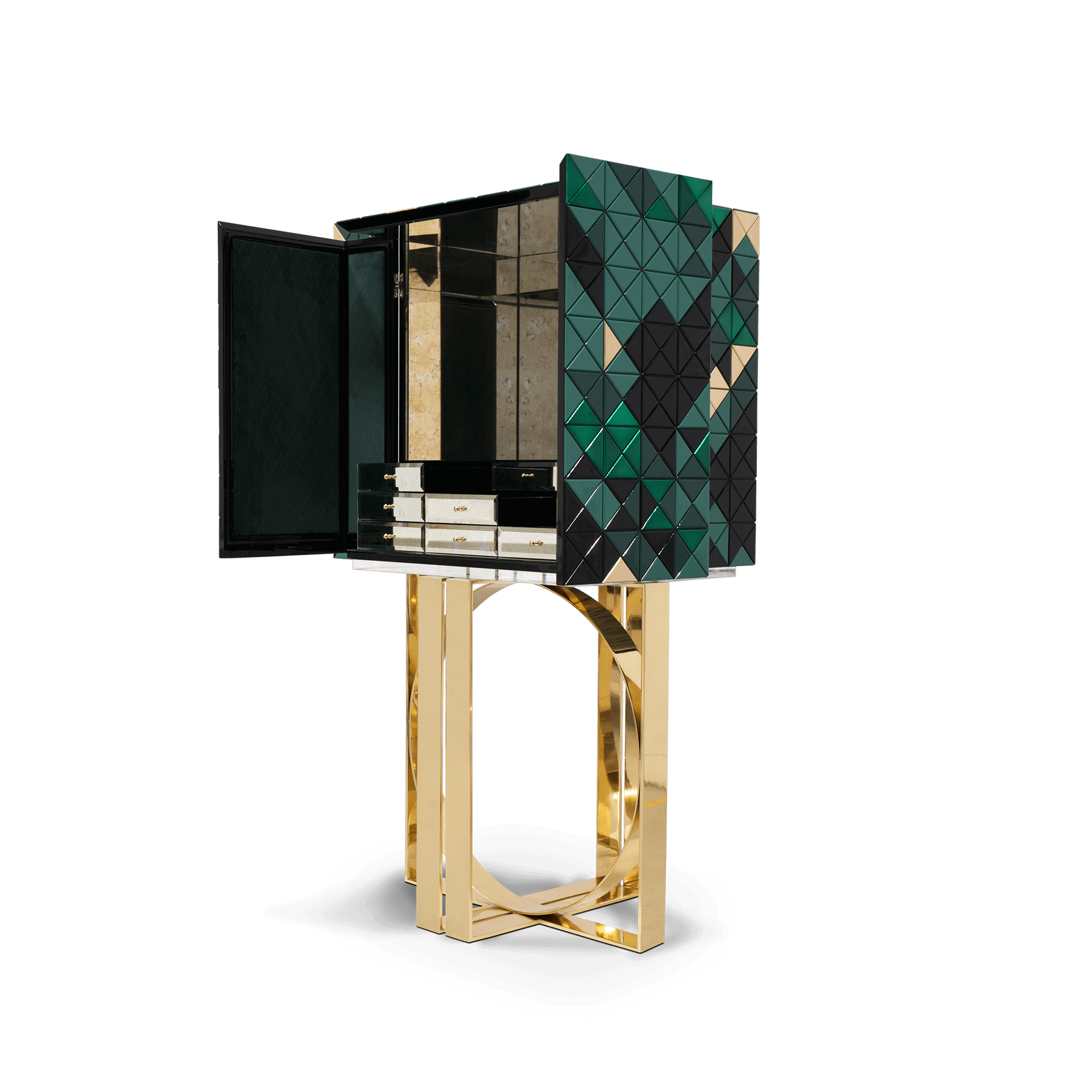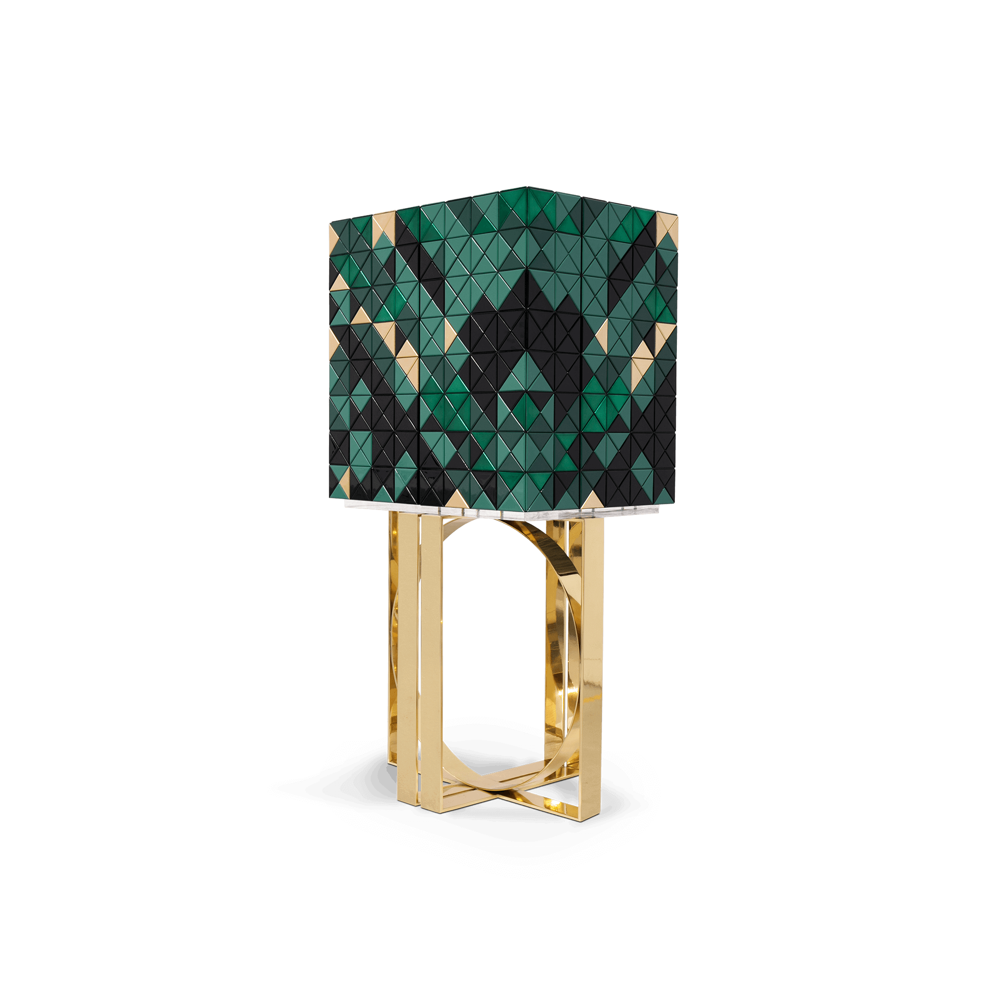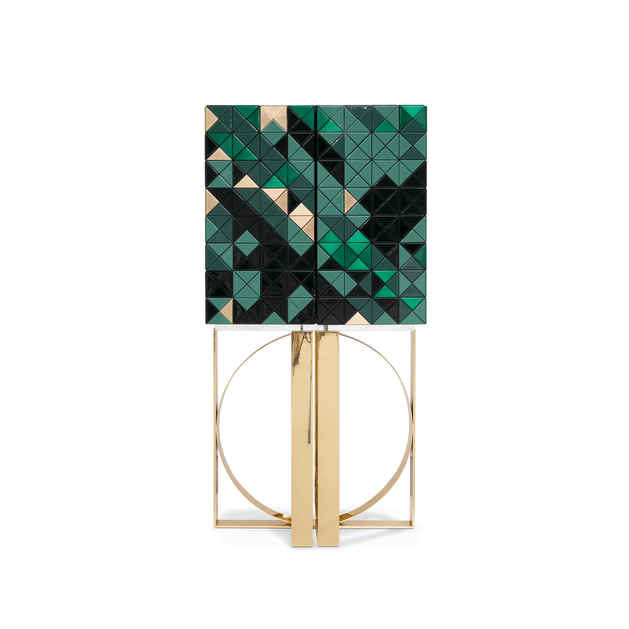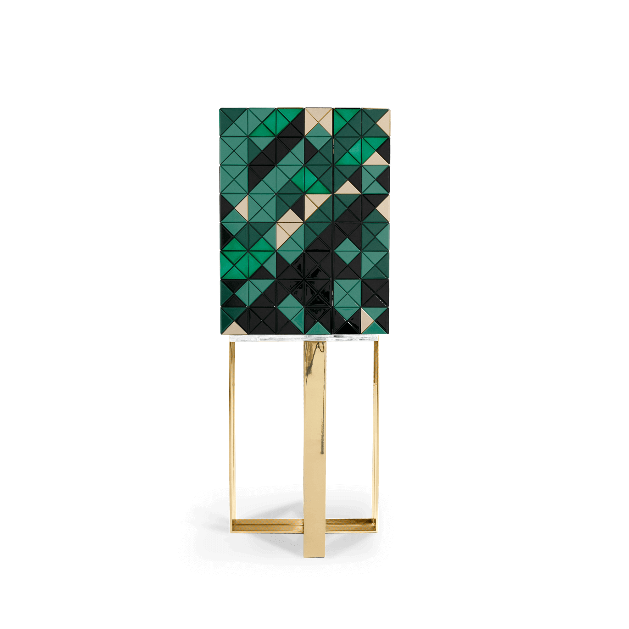 Iconic and unparalleled, the Pixel Cabinet presents a ground-breaking work of pioneering design. This piece carries the dedication and art of those who built it, a variety of traditional production techniques to craft an avant-garde furniture piece that is authentic, joyful and a perfect match for the digital age. Its playful character is captured in shape and color palette, challenging design and finest craftsmanship. Made out of 1088 triangles, the upper part of the Pixel Cabinet plays with perception and combines exceptional materials with multicolored compositions to give the cabinet a unique, striking design: handmade leaf gilding triangles, 10 different types of wood leafs from golden to Dark Green veneer, and lacquering. Behind its two doors, this bar cabinet surprises with a timeless combination of aged mirror and a diamond quilted green silk fabric, containing nine interior drawers, each one with its own golden knob. The polished brass base gives Pixel a unique and sophisticated character.