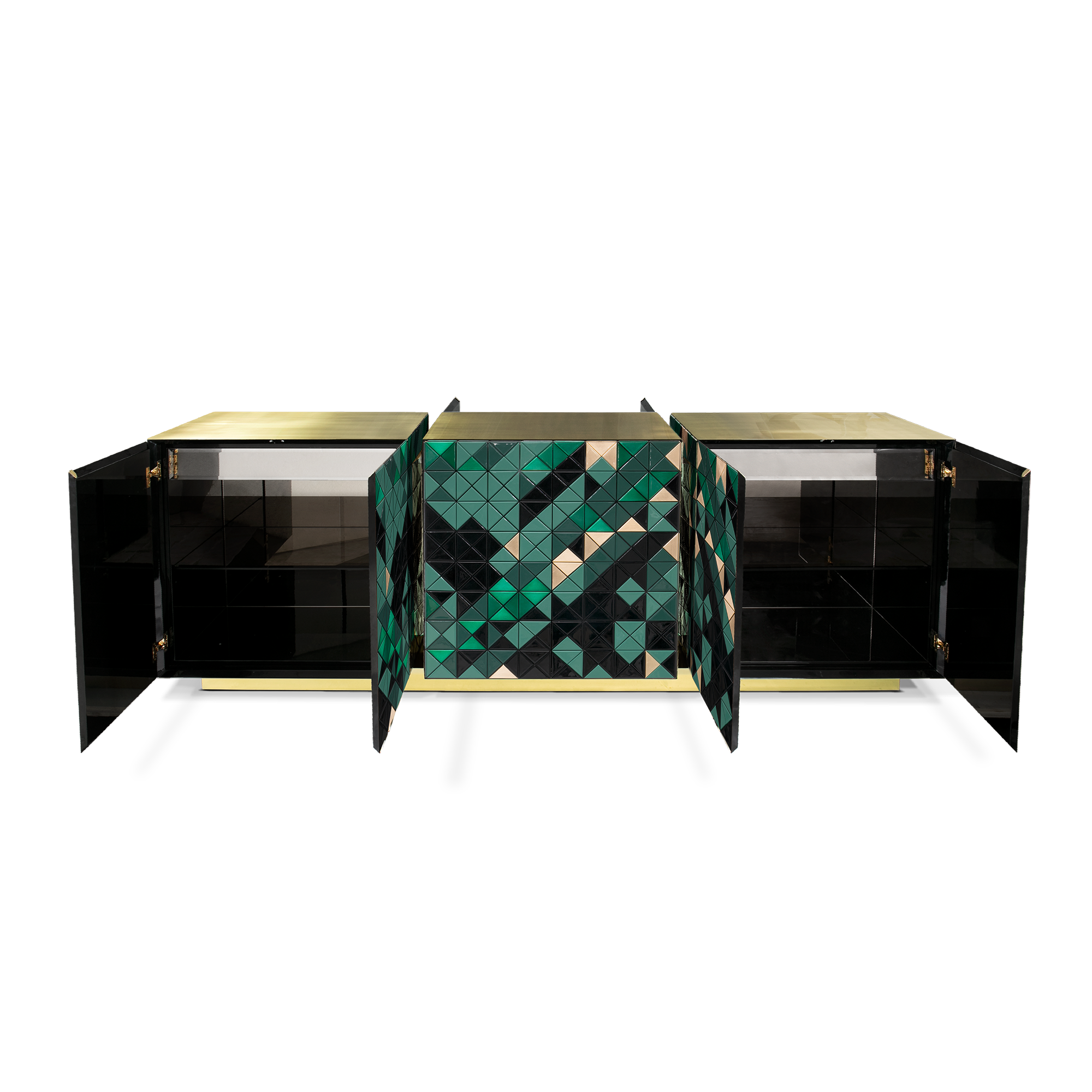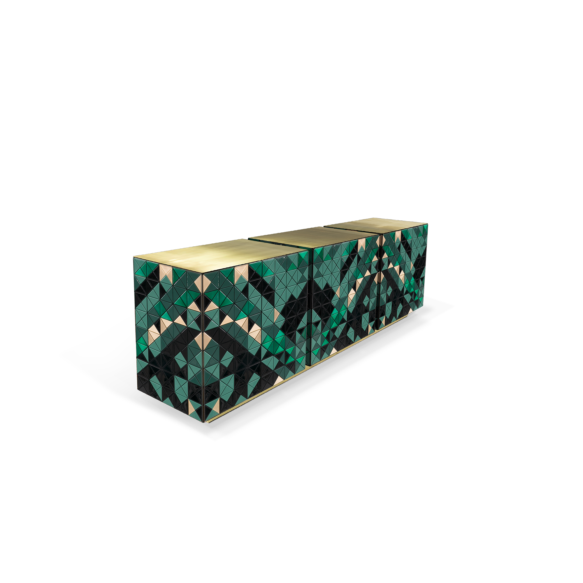 Double-sided sideboard with three doors covered by triangles. Different tones of stainless steel with brushed and polished finishes. Interior: 3 drawers (one per module), mirror, glass shelf, and black lacquered finish. Base and top: brushed brass with a satin finish.