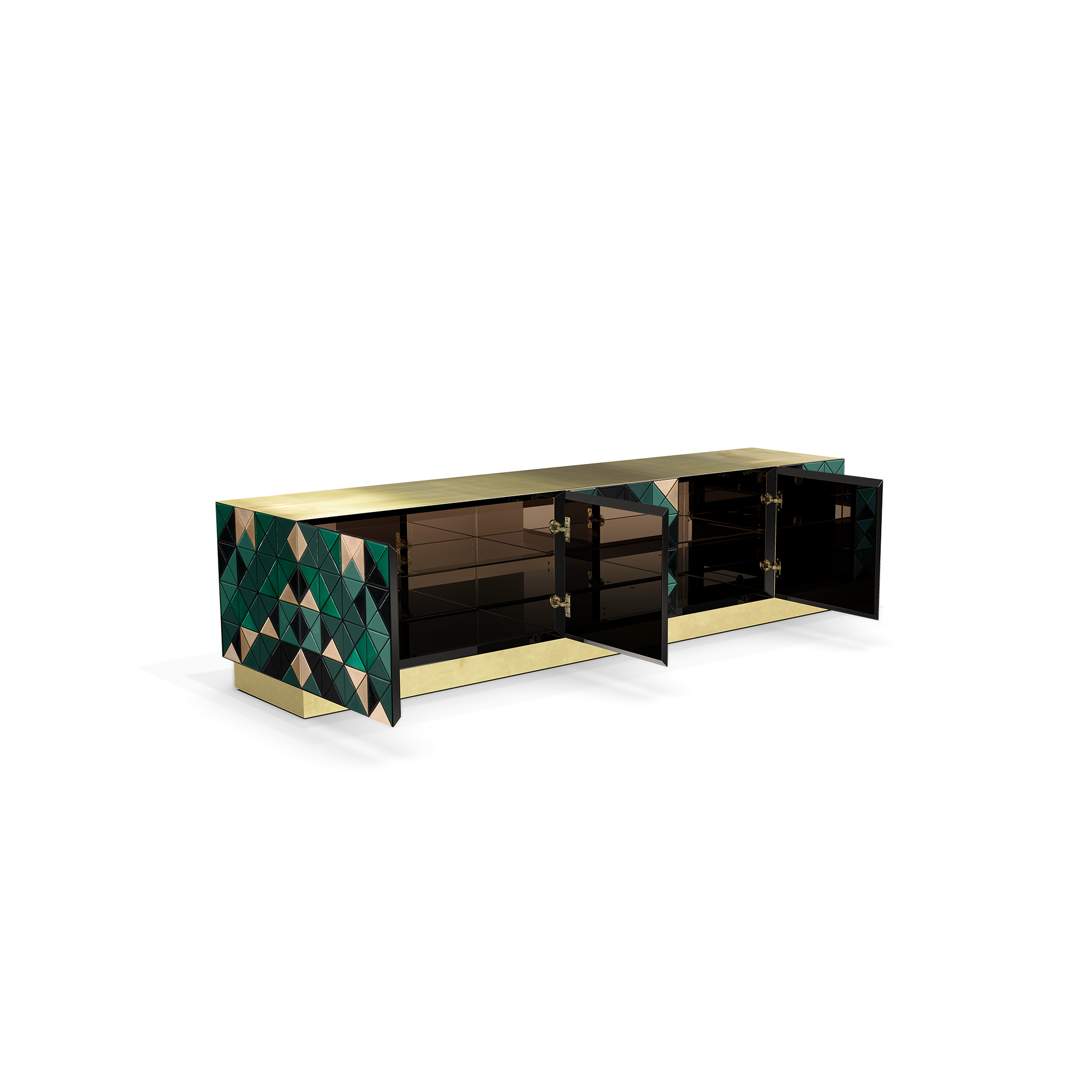 Iconic and unparalleled, the Pixel TV Cabinet introduces a groundbreaking work of pioneering design. This piece embodies the dedication and artistry of its creators, employing a variety of traditional production techniques to craft an avant-garde furniture piece that aligns with the digital age. Its playful character is evident in both shape and colour palette, challenging conventional design norms with the finest craftsmanship. Constructed with 1088 triangles, the upper part of the Pixel TV Cabinet plays with perception, combining exceptional materials with a green composition to give the cabinet a unique and striking design, making it a perfect addition to modern living spaces.