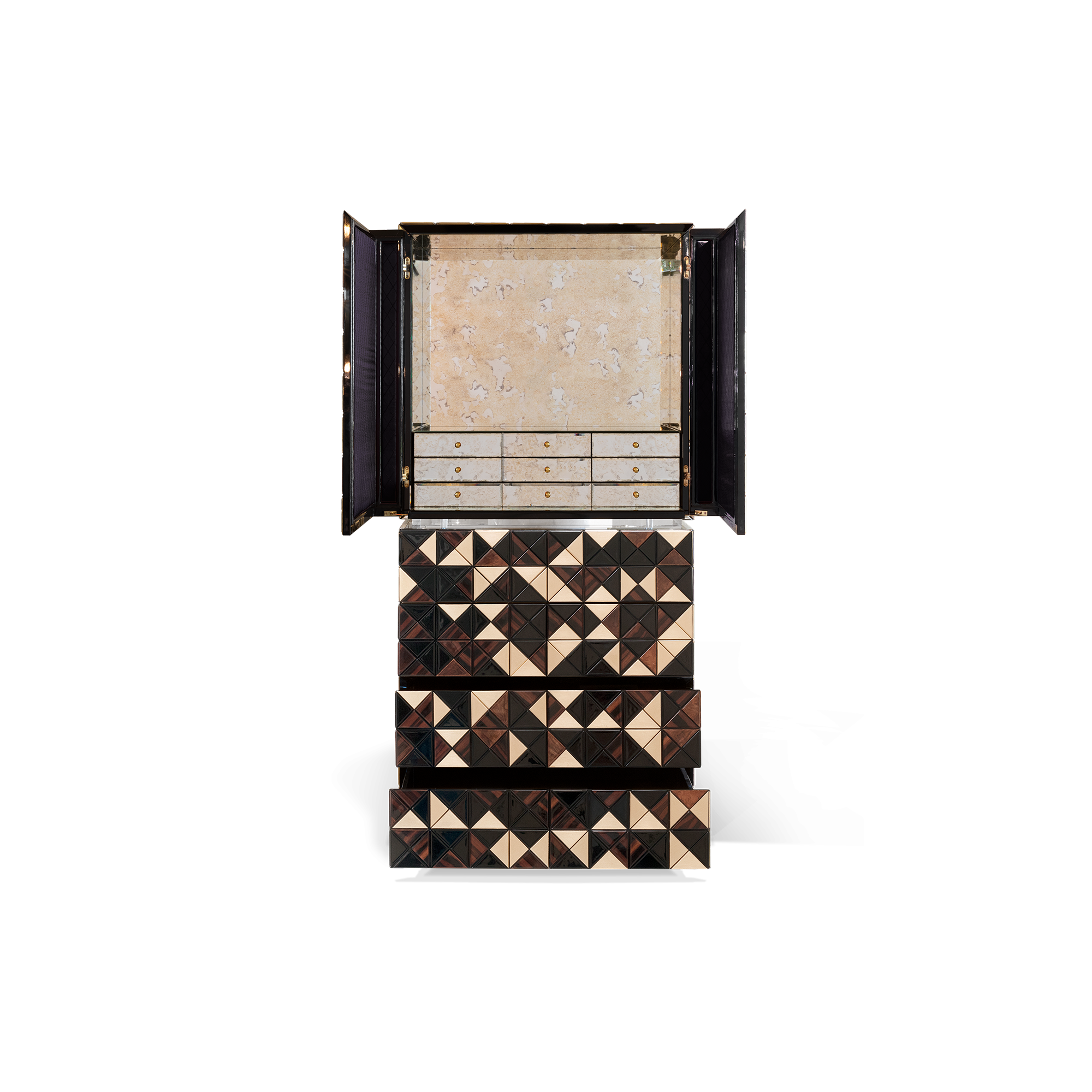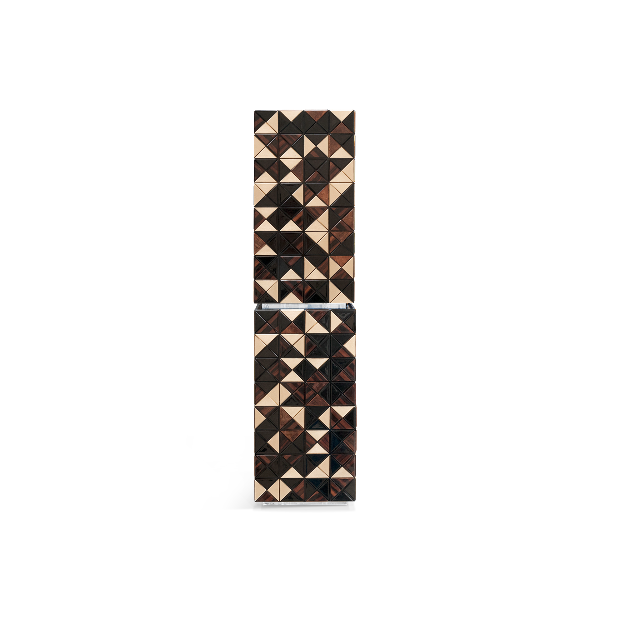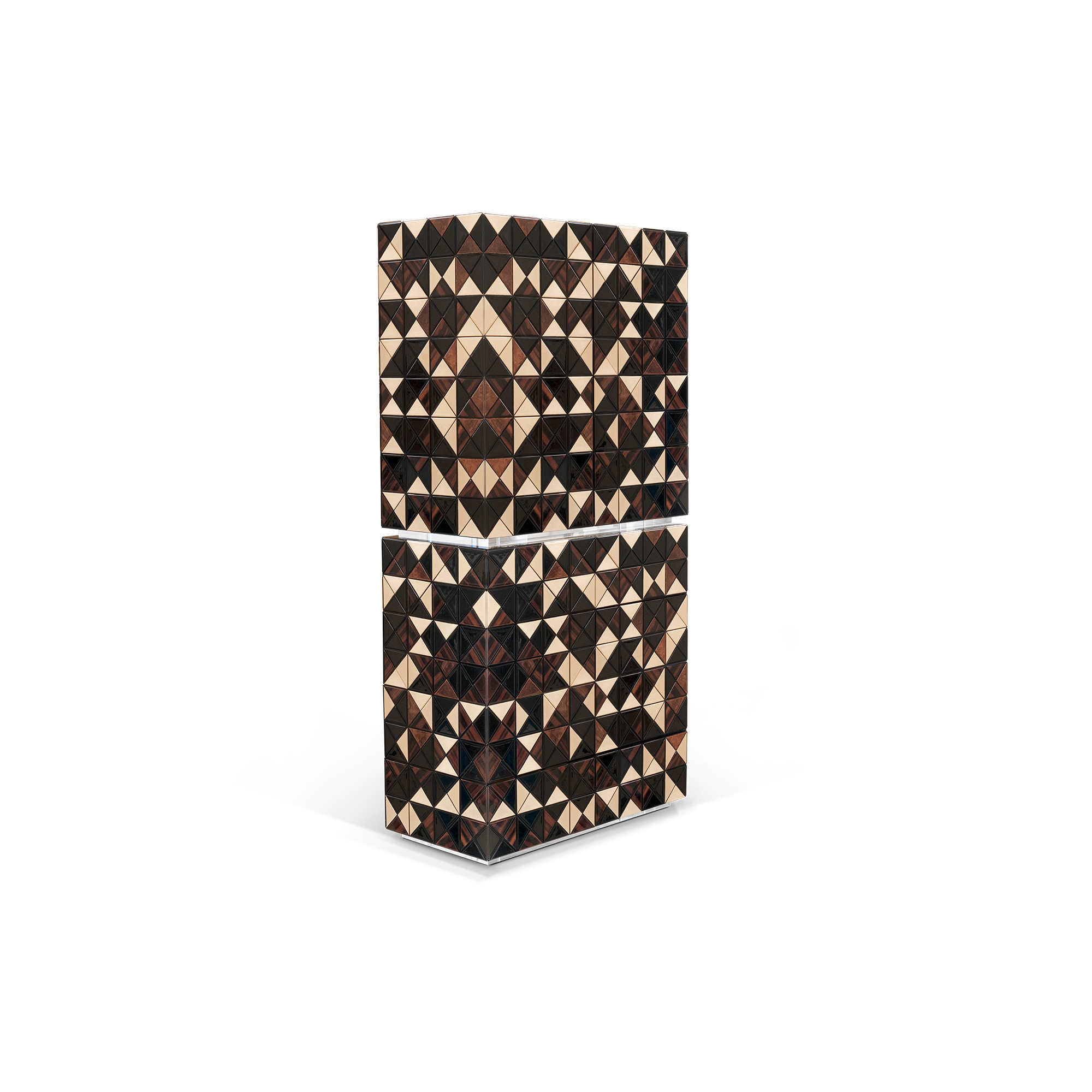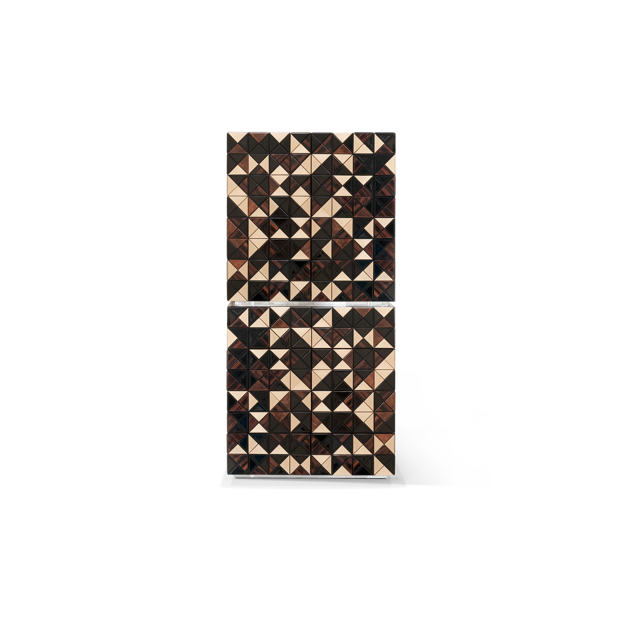Iconic and unparalleled, the Pixel Bar Cabinet presents a ground-breaking work of pioneering design. This piece carries the dedication and art of those who built it, and a variety of traditional production techniques to craft an avant-garde furniture piece that is authentic, joyful and a perfect match for the digital age. Its playful character is captured in shape and colour palette, challenging design and finest craftsmanship. Made out of 1088 triangles, the upper part of the Pixel Bar Cabinet plays with perception and combines exceptional materials with a walnut composition to give the cabinet a unique, striking design.