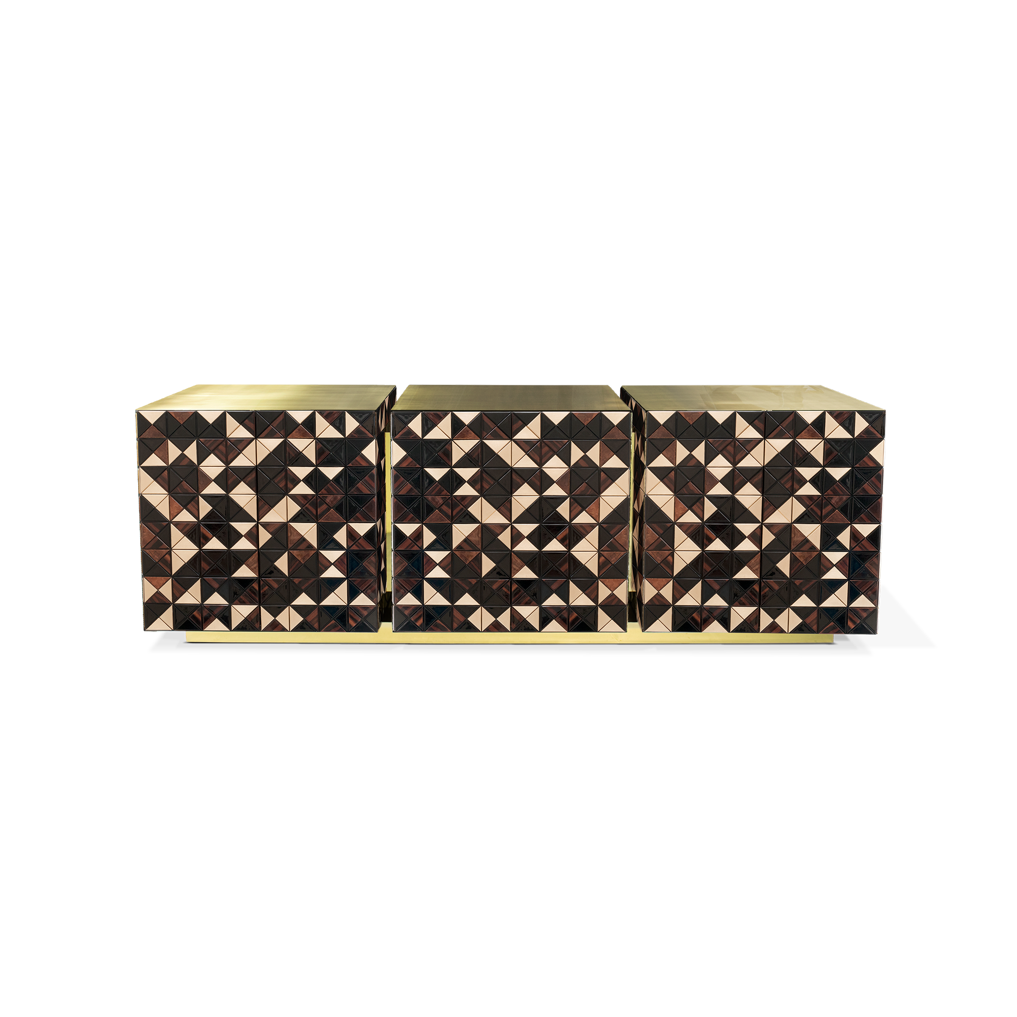 Made of wooden triangles in a diversity of wood and finishes: walnut root veneer, ebony veneer, gold leaf, and black lacquer. Double-sided sideboard with three doors, different tones of stainless steel with brushed and polished finishes. Interior: 3 drawers (one per module), mirror, glass shelf, and black lacquered finish. Base and top: brushed brass with a satin finish.