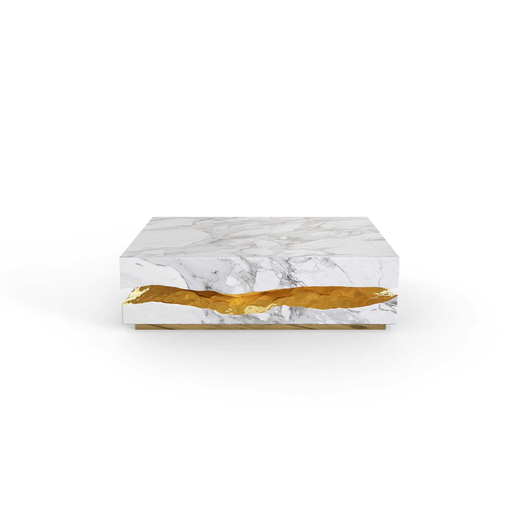 The Quarry Center Table takes exceptional craftsmanship and design to a new level of sophistication. Inspired by raw stone’s natural forms and beauty, this coffee table is a celebration of organic elegance. Made from Carrara marble, its surface displays unique natural veins that tell a story thousands of years old. Complementing this natural beauty, the polished brass frame adds a luxurious shine, creating a harmonious contrast with the marble. The hand-carved details in the marble and brass convey a sense of movement and fluidity. At the same time, the combination of noble materials ensures that this coffee table is as durable as it is beautiful. The Quarry Center Table brings a new perspective to contemporary interior design, offering a duality of strength and sophistication that transforms any space.