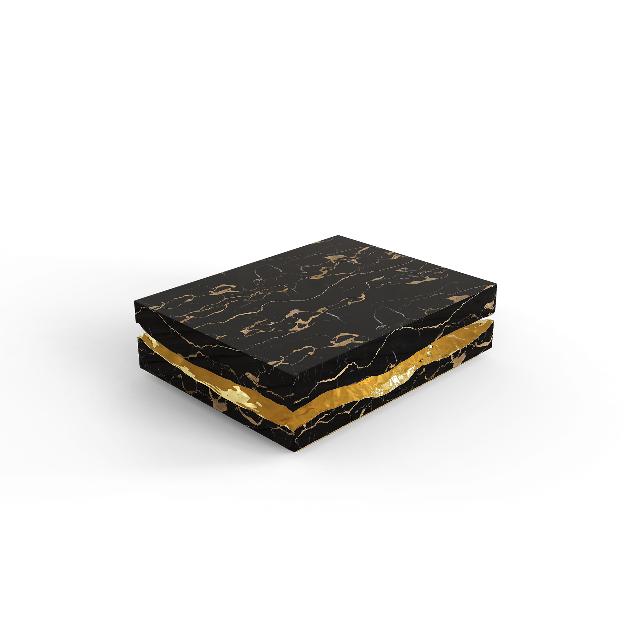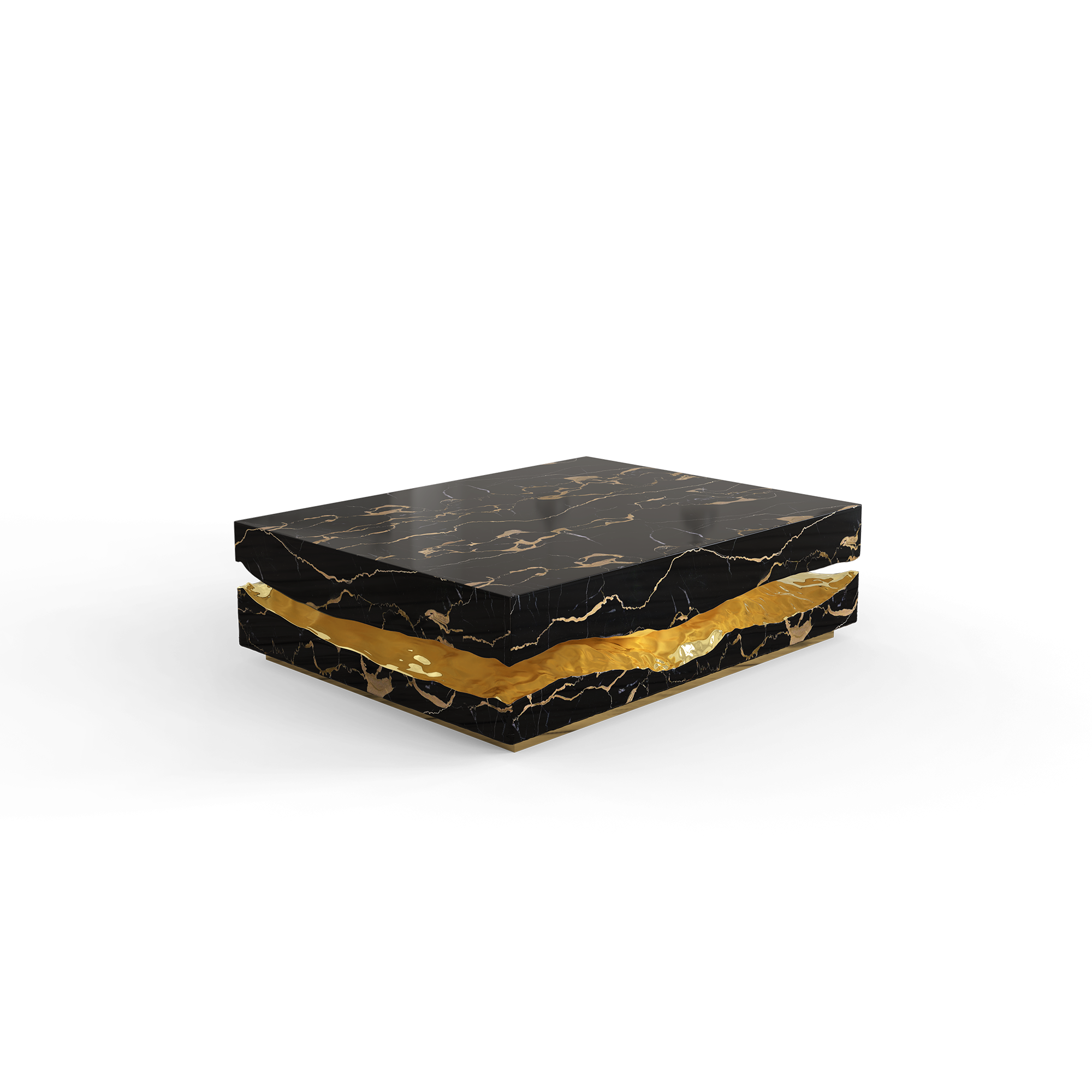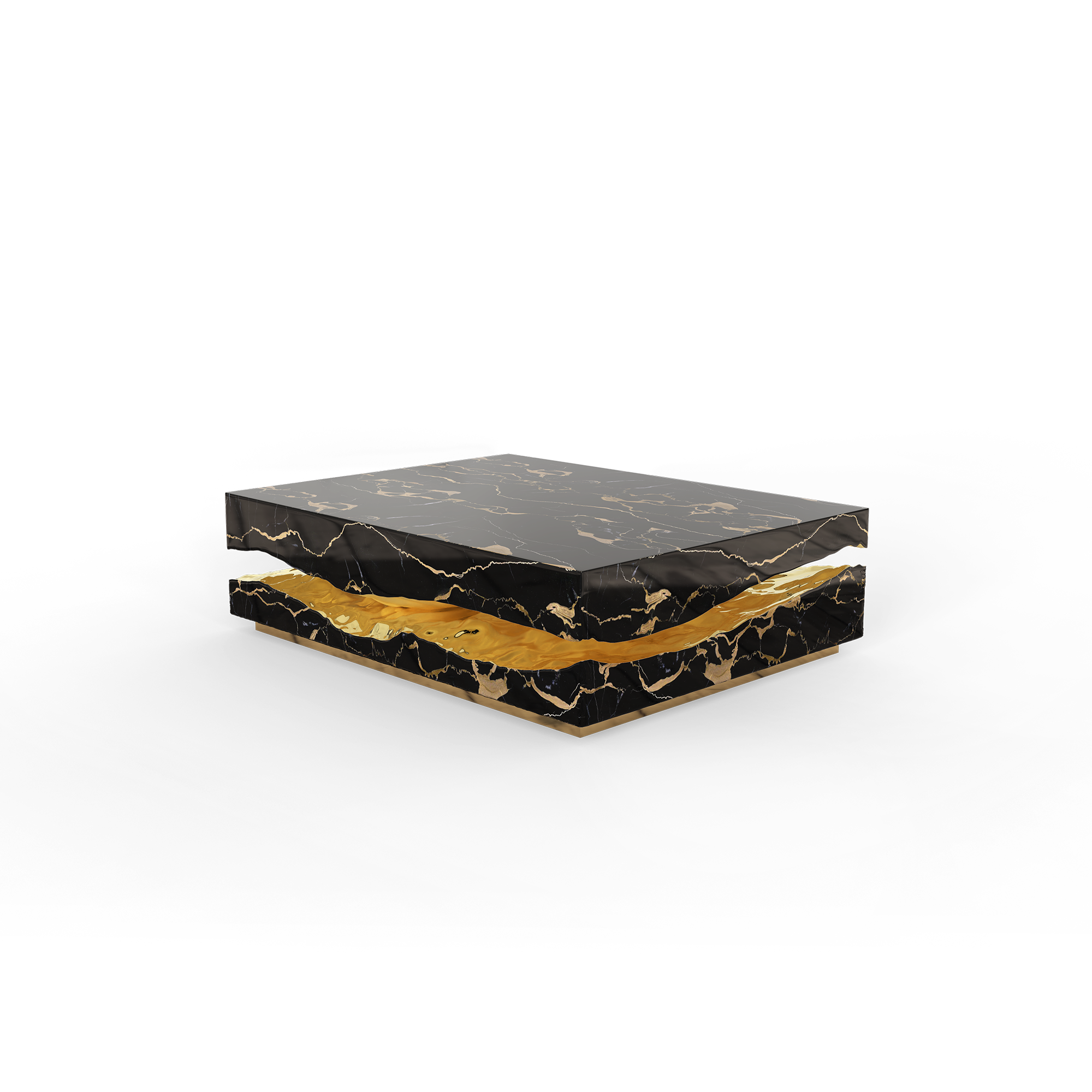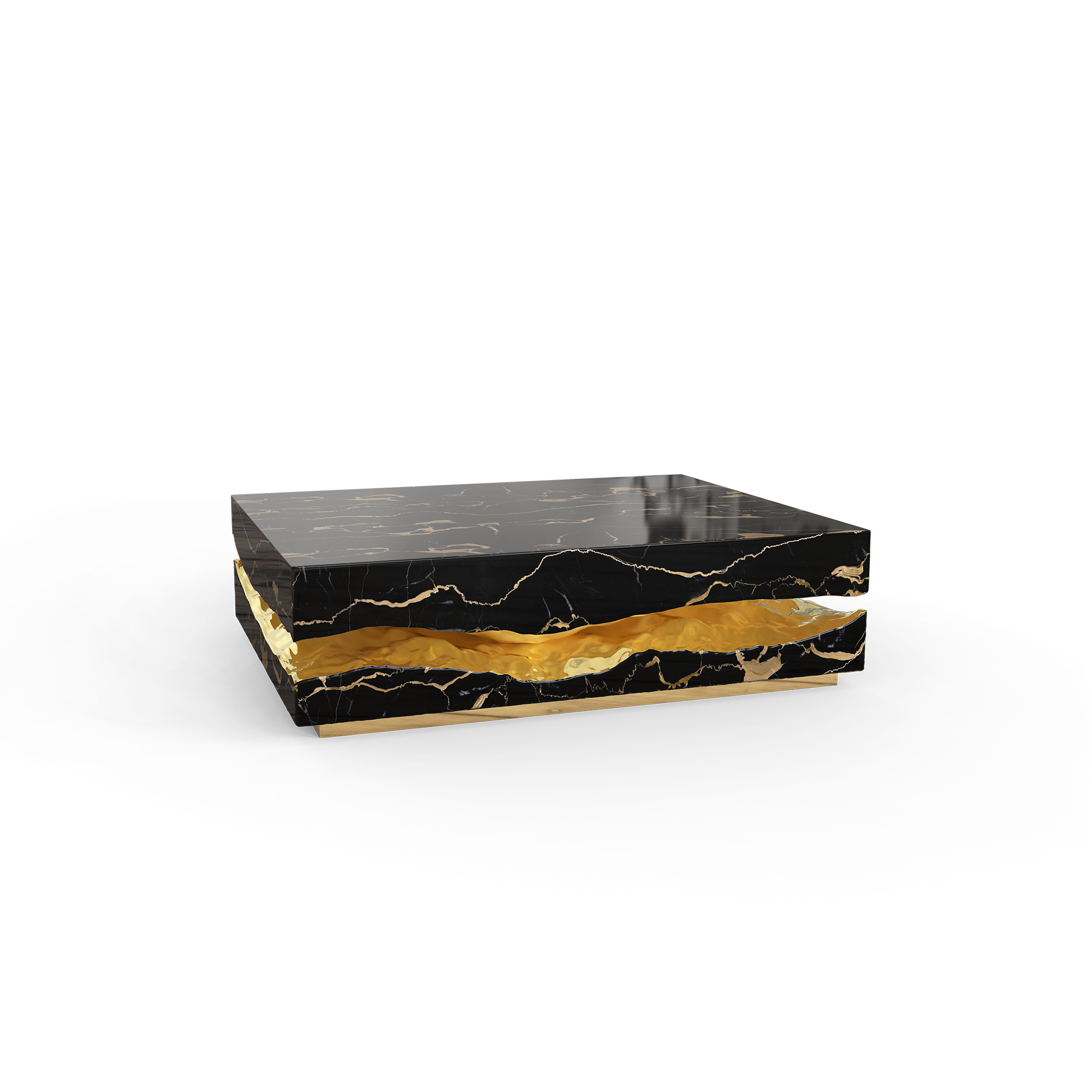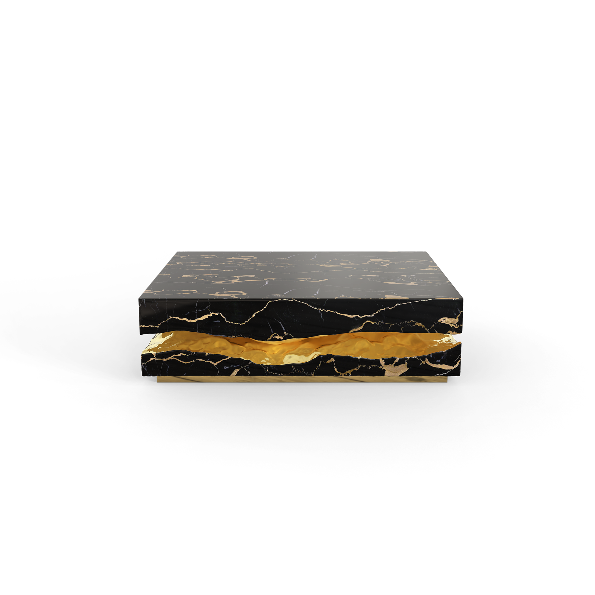 The Quarry Center Table takes exceptional craftsmanship and design to a new level of sophistication. Inspired by raw stone’s natural forms and beauty, this coffee table is a celebration of organic elegance. Made from Portoro marble, its surface displays unique natural veins that tell a story thousands of years old. Complementing this natural beauty, the polished brass frame adds a luxurious shine, creating a harmonious contrast with the marble. The hand-carved details in the marble and brass convey a sense of movement and fluidity. At the same time, the combination of noble materials ensures that this coffee table is as durable as it is beautiful. The Quarry Center Table brings a new perspective to contemporary interior design, offering a duality of strength and sophistication that transforms any space.