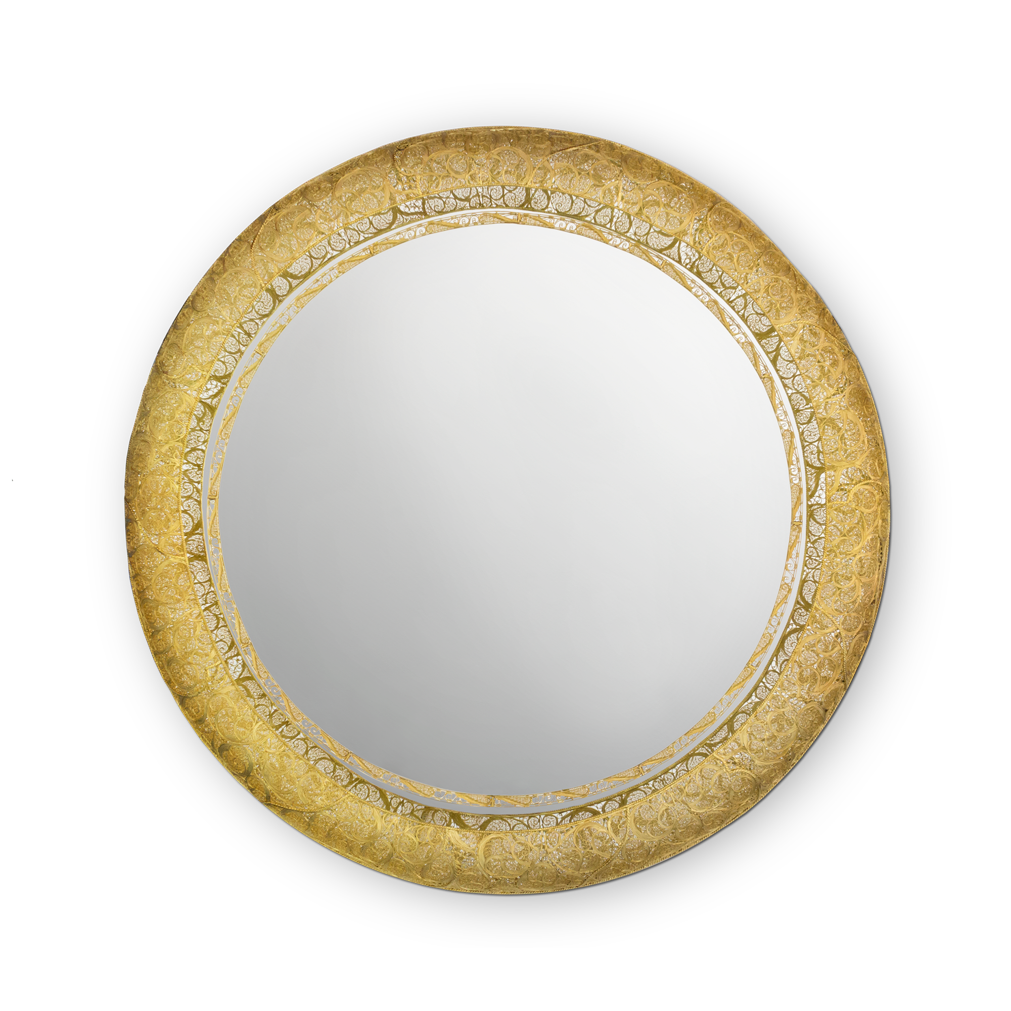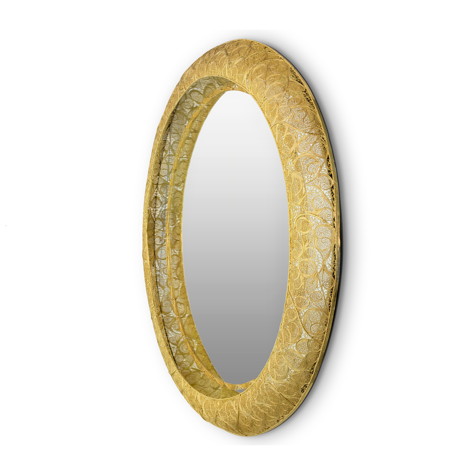 The Filigree Ring Mirror resorts to one of the oldest jewellery making techniques known. Completely handcrafted, with each brass cord fitted with precision, the Filigree Ring flourishes in a traditional homage to Portuguese culture and commitment, like a jewel that reflects eternal beauty when it is contemplated. The large wall mirror’s edge is made of brass cords gilded in 18k gold, conceiving an exquisite gold round frame that elevates any setting into world-class interiors. The richness of Filigree Ring lies within its detailed jewelry expression in which skilled artisans painstakingly solder tiny beads and twisted threads to create striking artistic motifs. A precious piece of art that pays tribute to the finest craftsmanship, ideal for a unique and exclusive home.