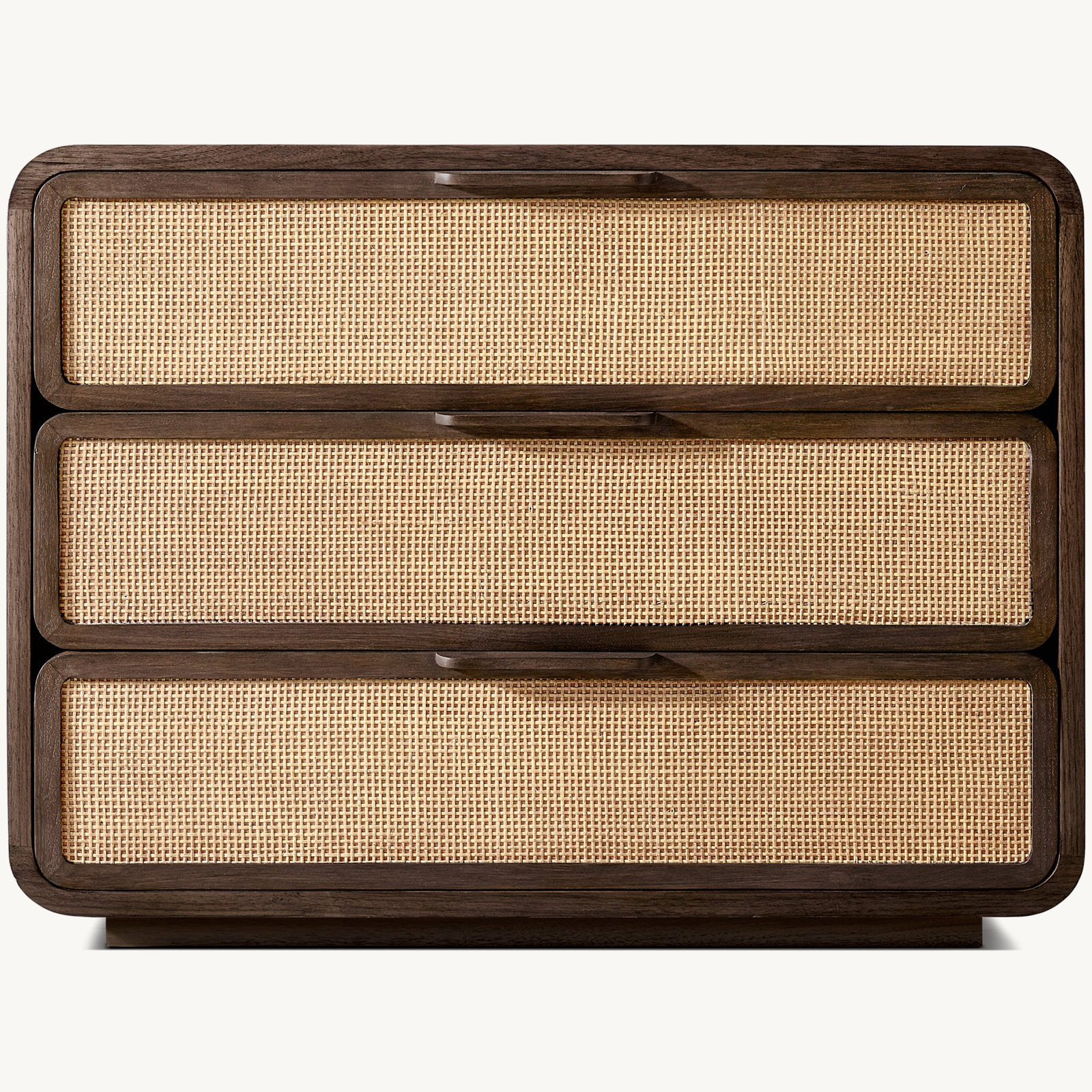 Drawer fronts are fitted with handwoven cane panels