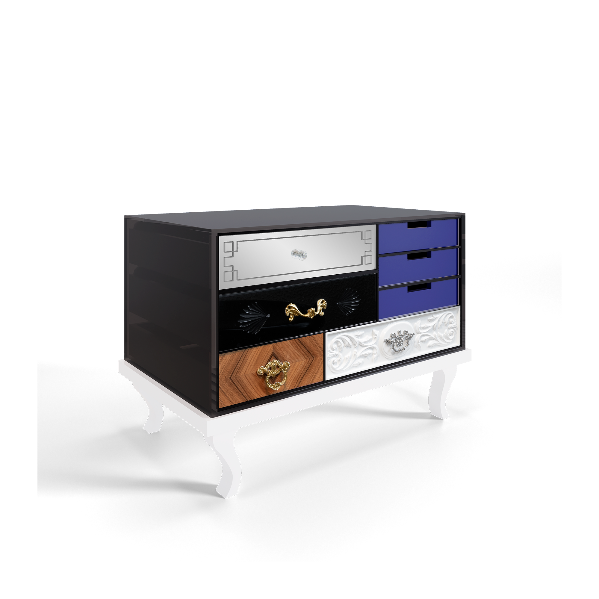 Soho Bedside Table is another addition to Soho Collection. Composed by a collection of wood drawers finished in mirror and black glass with etched detailing, gold leaf, diamond mateched rosewood veneer, high gloss blue or pink lacquer, and white lacquer with hand carved relief patterning. The drawers are accented with handmade brass pulls, some of which are plated in chrome, and cut glass knobs; they are encased in a bronze glass box supported by a high gloss.