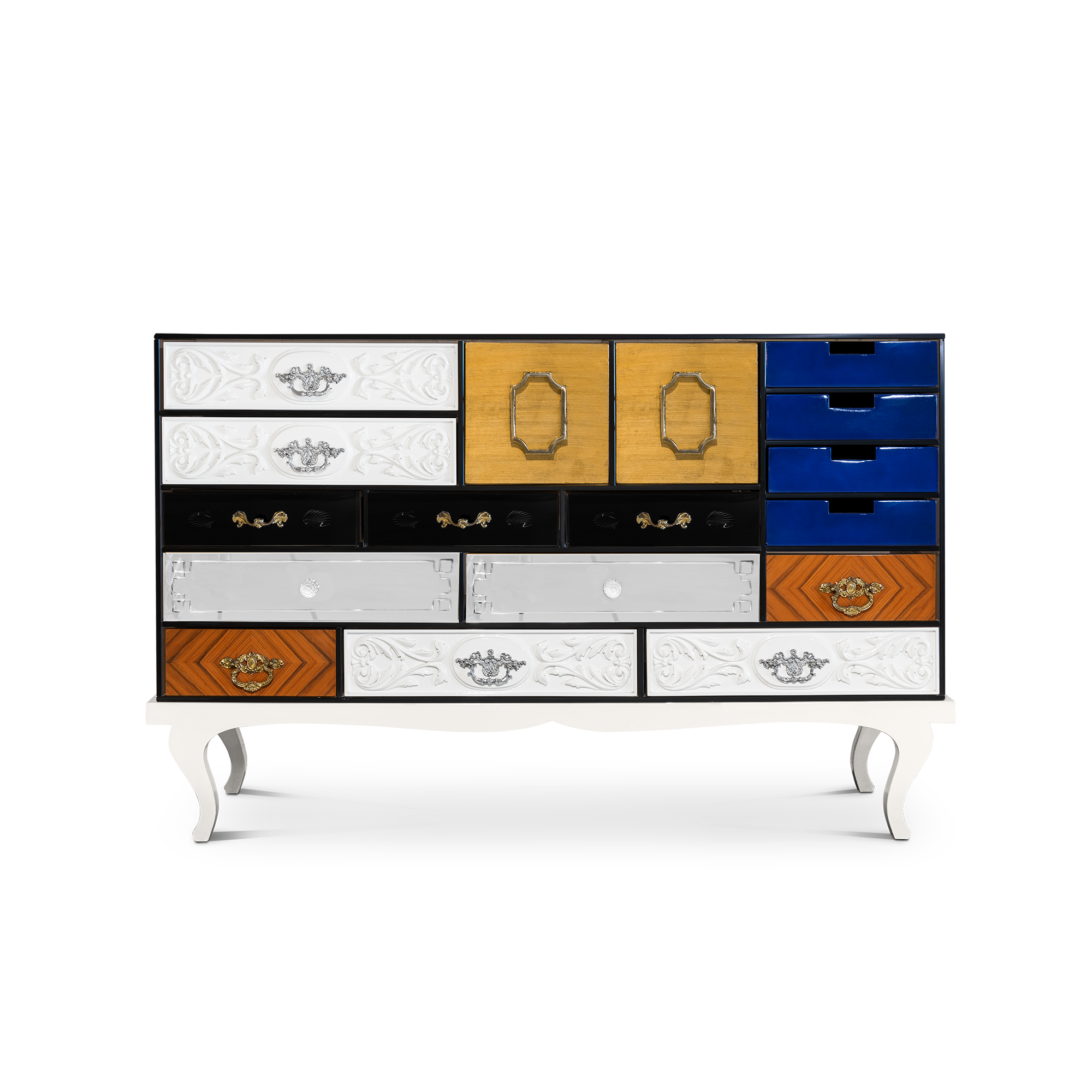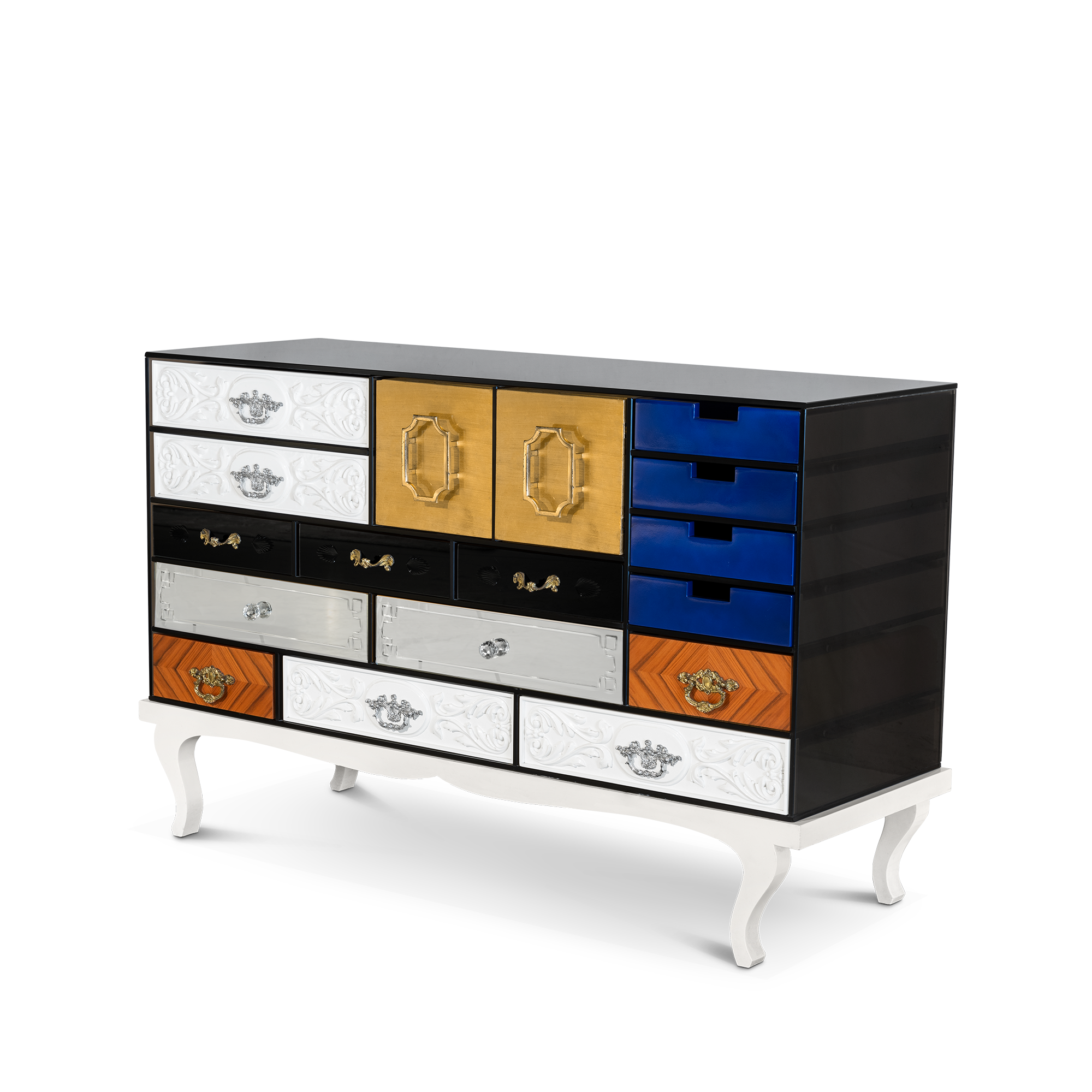 This sideboard bases is made from wood and tempered glass. Composed by 15 drawers and two doors. Its base is made in lacquered wood. It contains drawers with: handcrafted fronts lacquered in white; fronts made by clear mirror and crystal handles; fronts made in maquetry and brass handles; fronts with golden leaf; fronts with black lacquered glass; and fronts lacquered in blue.