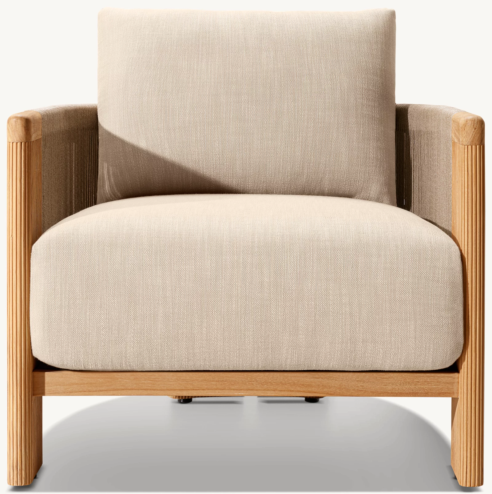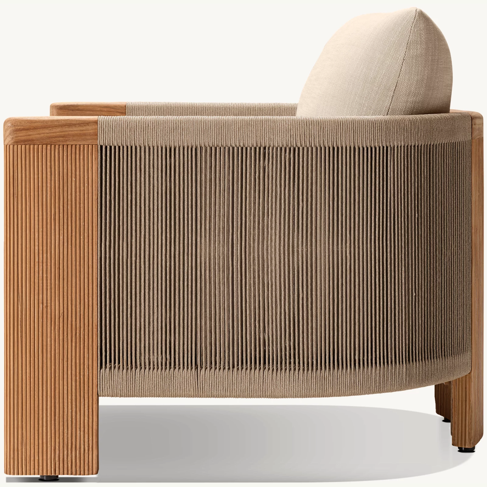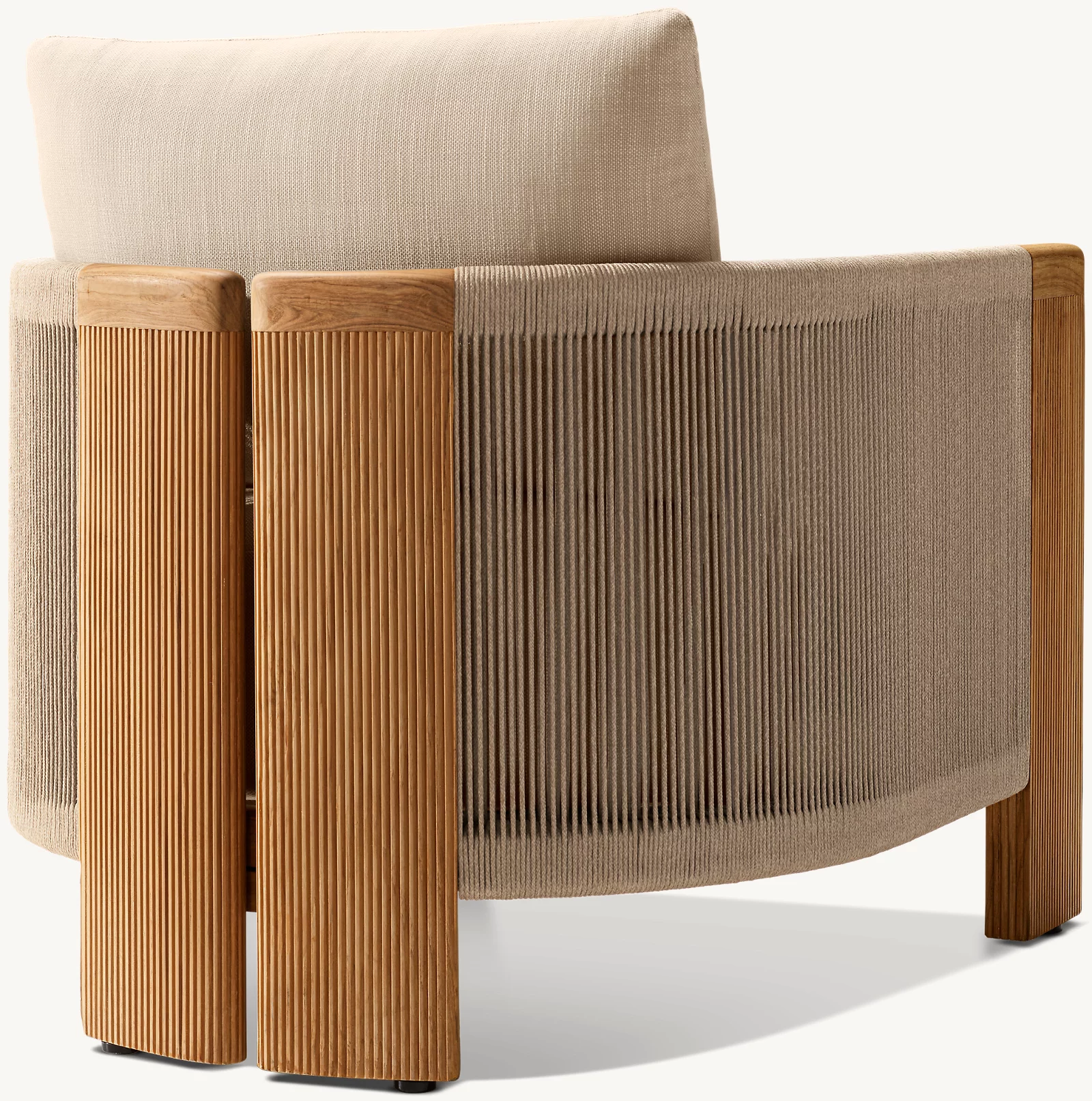 Handcrafted by Indonesian artisans from sustainably harvested premium solid teak, the Striata collection features a curved tripod frame accented by handwoven all-weather rope