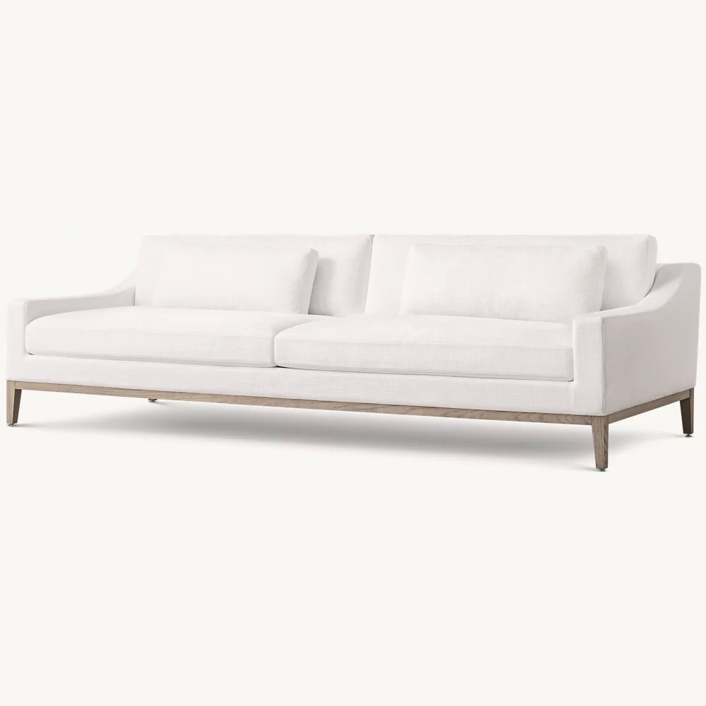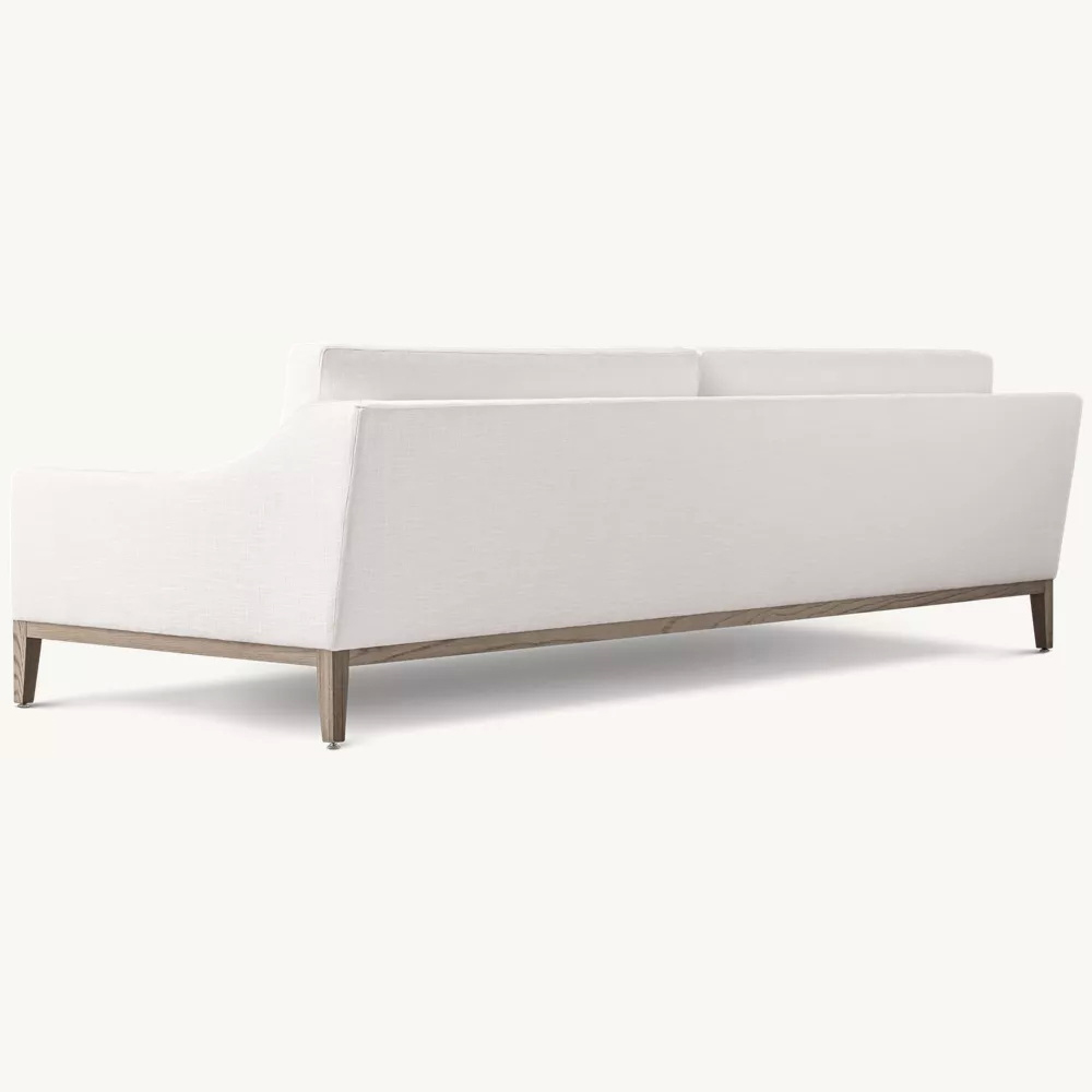 Slender base and legs handcrafted of oak. 9′ and 10′ sofas include an adjustable, clear acrylic leg at the center for added support.