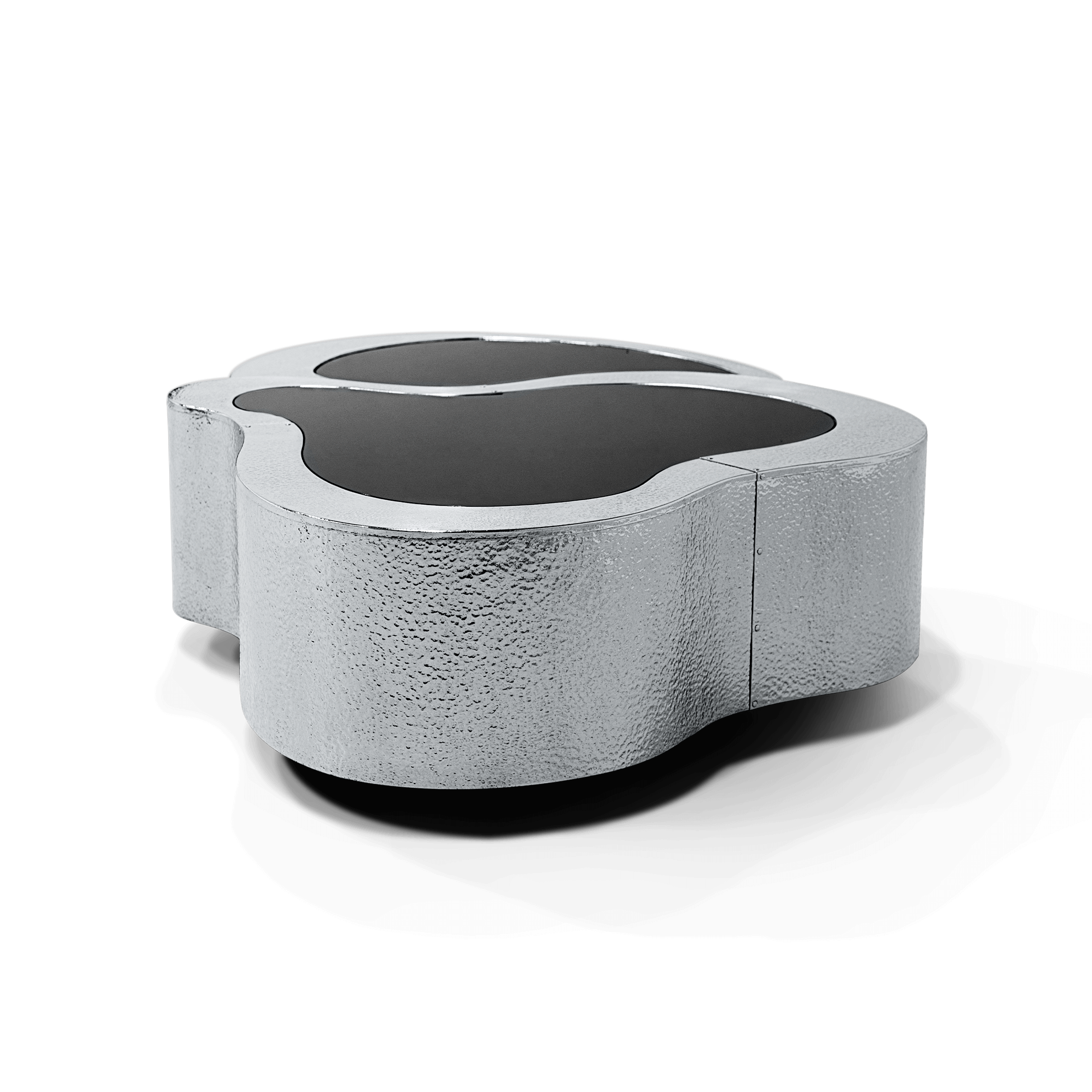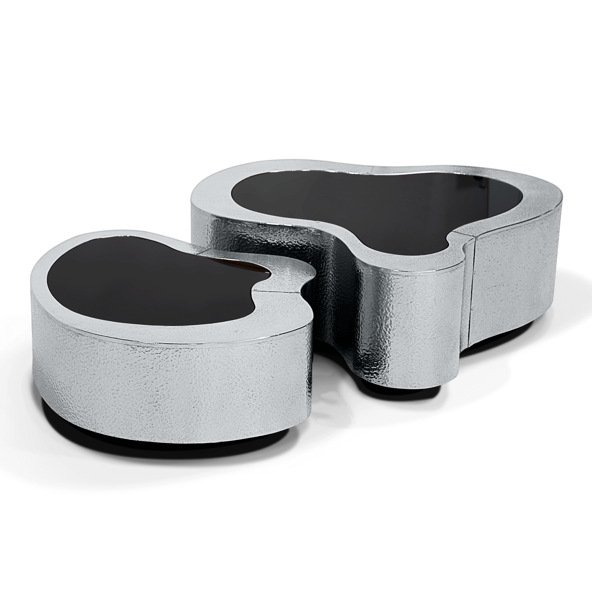 Table made in wood finished with manually hammered stainless steel, with a curvilinear top made from black mirror. The base is lacquered in black finished with a high gloss varnish.