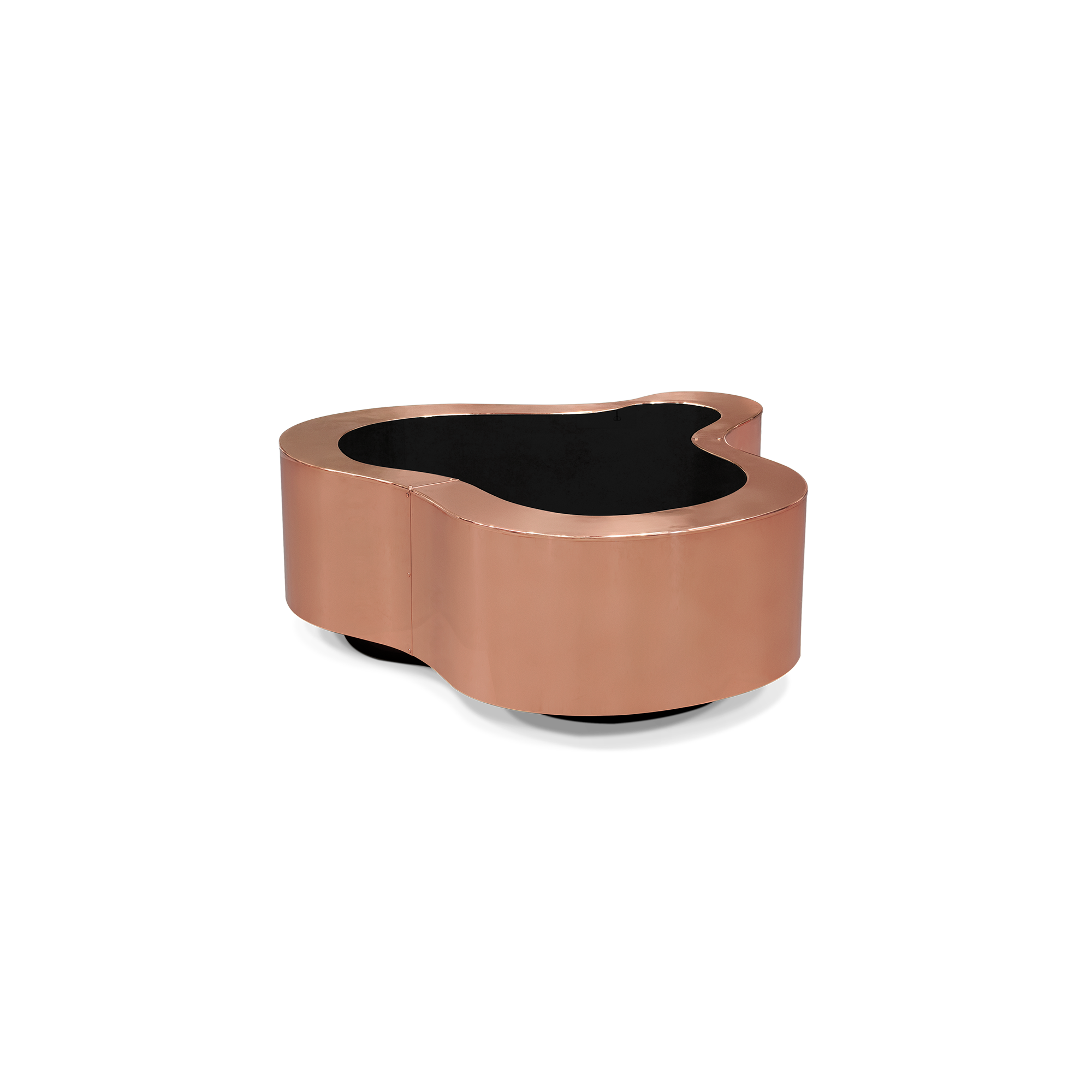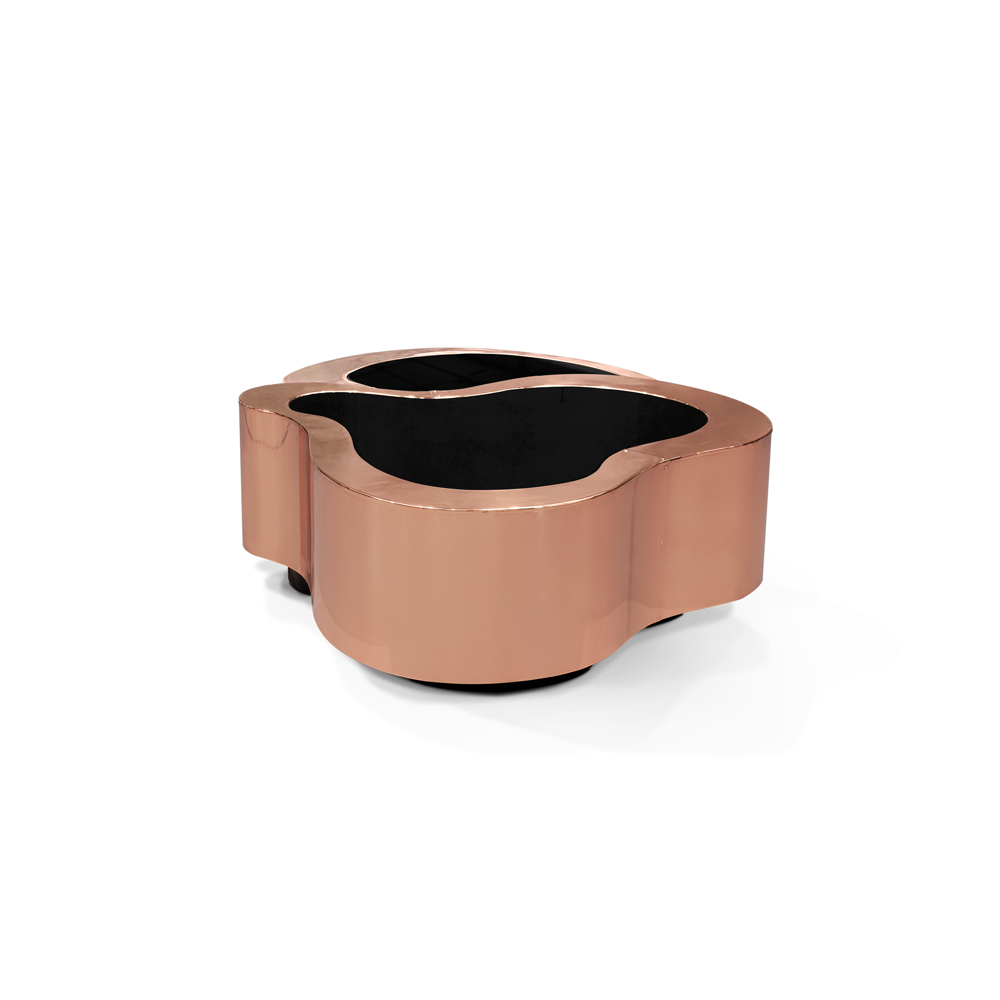 Table made in wood finished with manually polished copper, with a curvilinear top made from black mirror. The base is lacquered in black finished with a high gloss varnish.