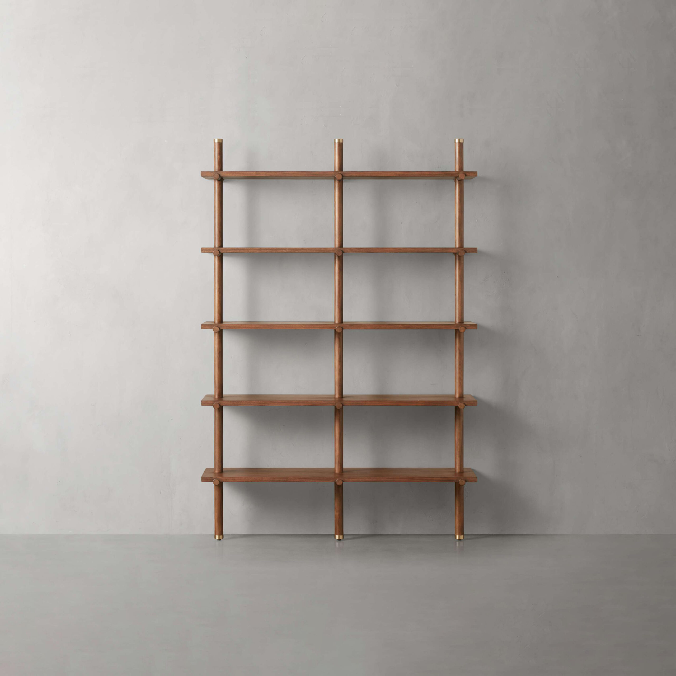 Shelves are crafted from walnut veneers and posts are crafted from solid beech wood accented by brass-finished stainless steel end caps.
